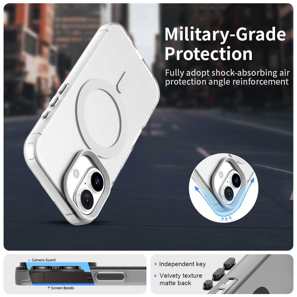 - Ütéselnyelő kialakítás: A "Military-Grade Protection" minősítésnek köszönhetően a tok hatékonyan elnyeli az ütéseket és a leejtésből eredő erőket. A sarkokba integrált ütéscsillapító légpárnák és a megerősített élek tovább fokozzák a védelem mértékét, garantálva a cseppvédelmet.