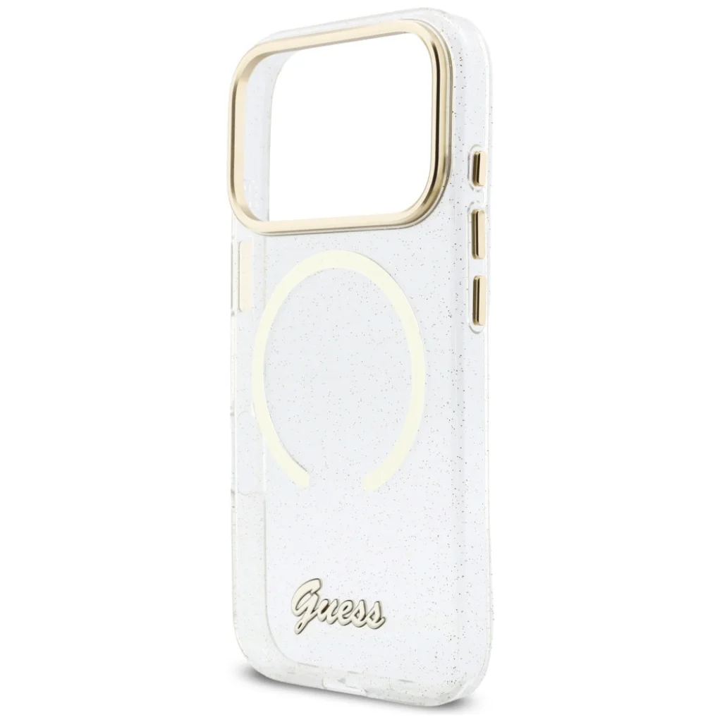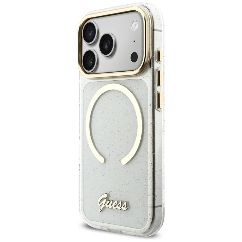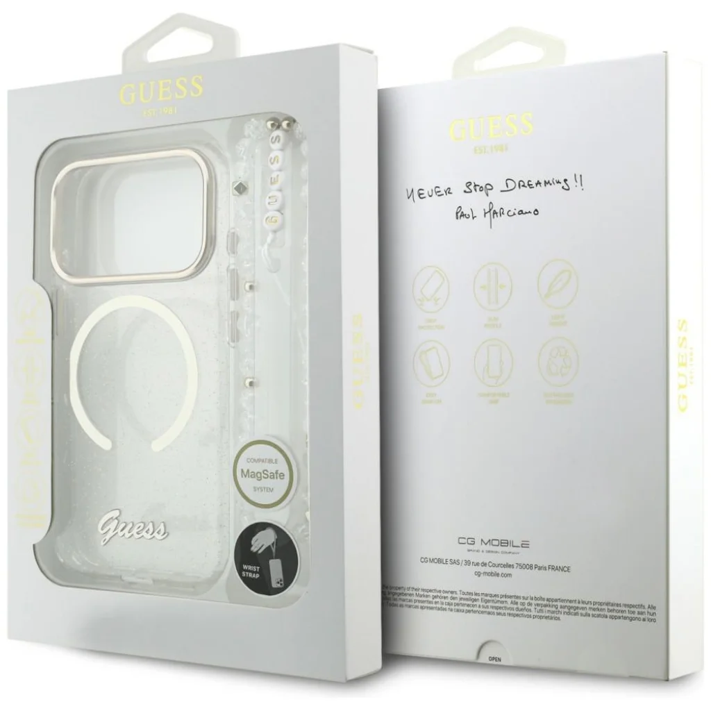 A Guess IML Glitter Script Strap MagSafe hátsó tok nagyszerű kiegészítő minden stílus és praktikusság kedvelőjének.