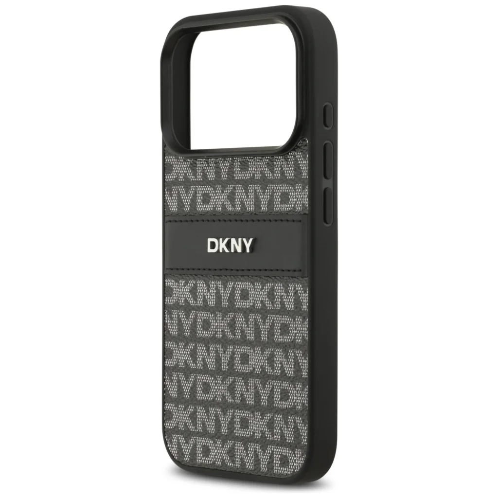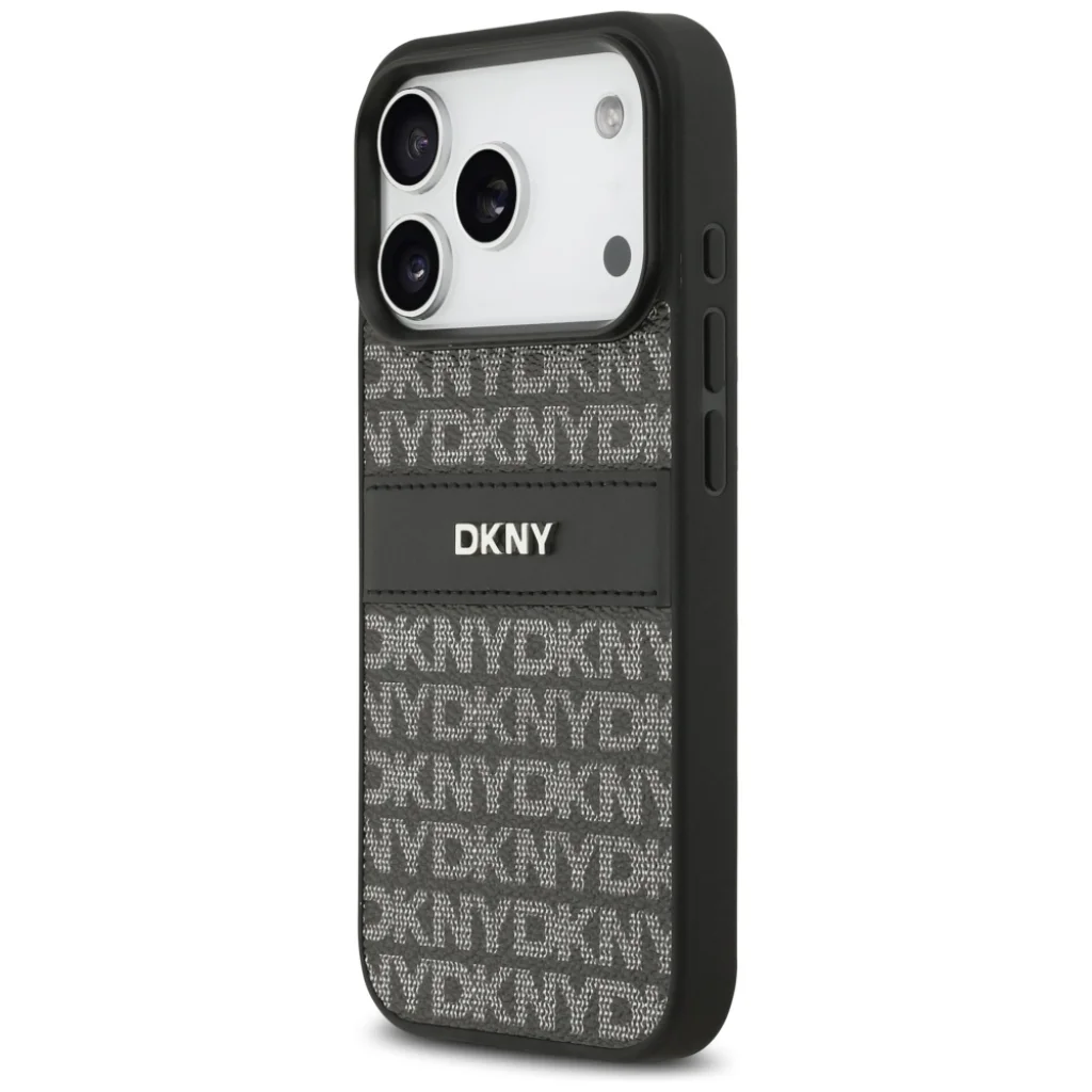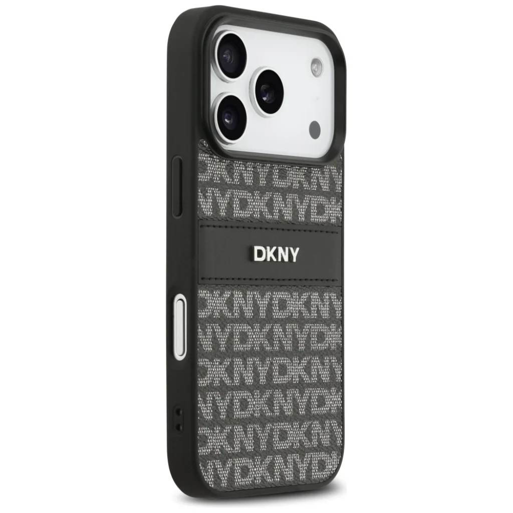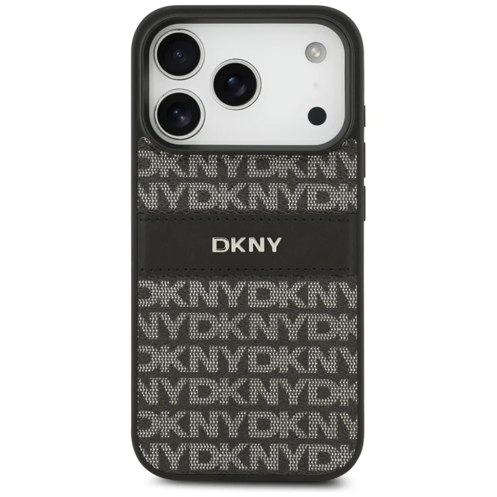 iPhone 17 Pro Fekete DKNY ismétlődő textúramintás tok árnyalatos csíkkal tok