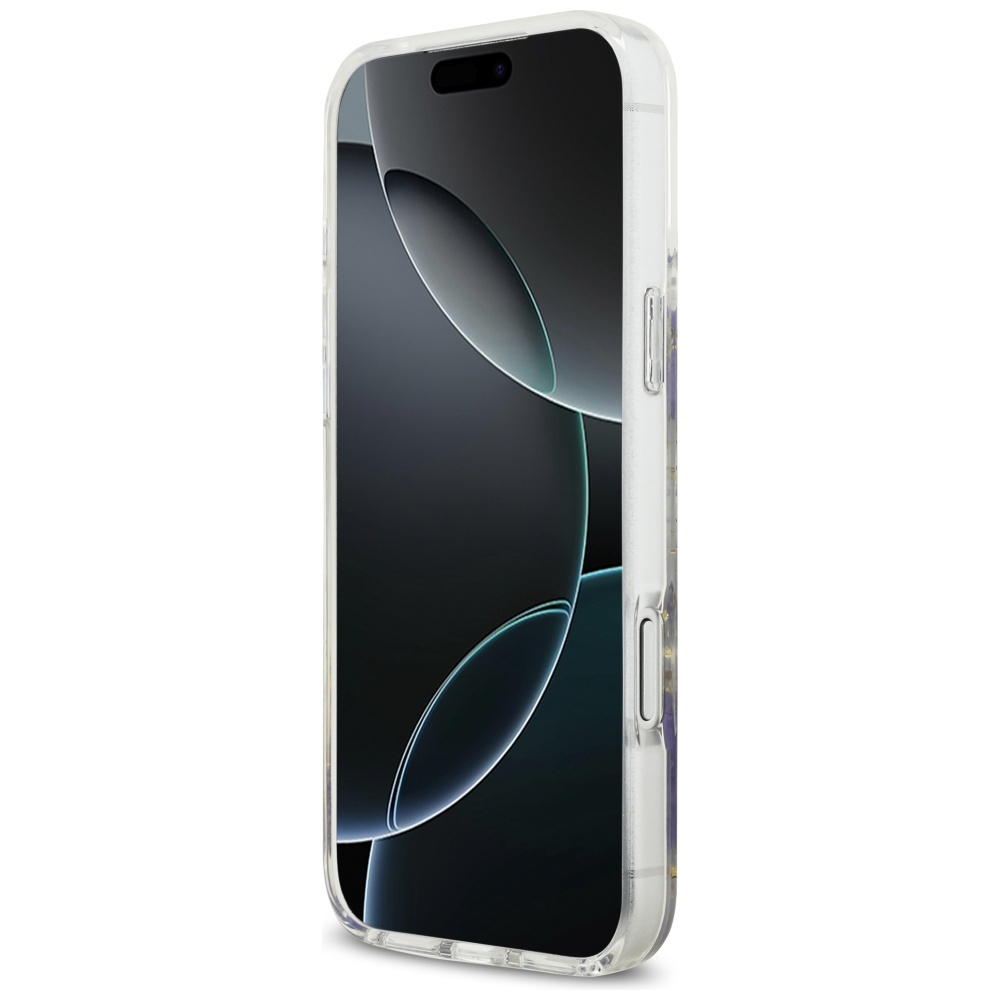 - A tok hátoldalán egy feltűnő, lila csillámos MagSafe gyűrű található, amely a "GUESS" logót foglalja magába. Ez nemcsak garantálja a tökéletes mágneses illeszkedést, hanem azonnal felismerhetővé teszi a márka stílusát.