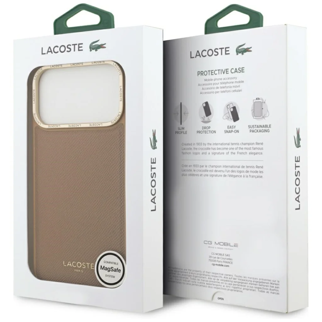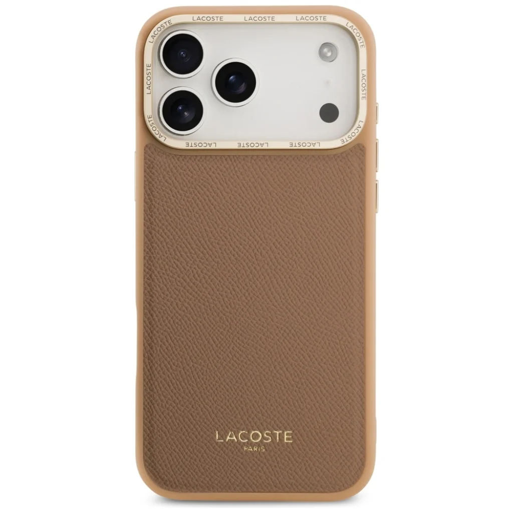 Stílusos megjelenés: A tok magas minőségű ökobőrrel van bevonva, amely érdekes textúrával rendelkezik. Ezenkívül a kollekciót arany LACOSTE logó és arany keret díszíti a kamera körül.
