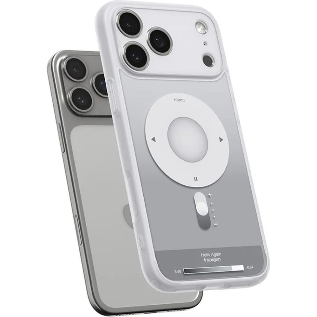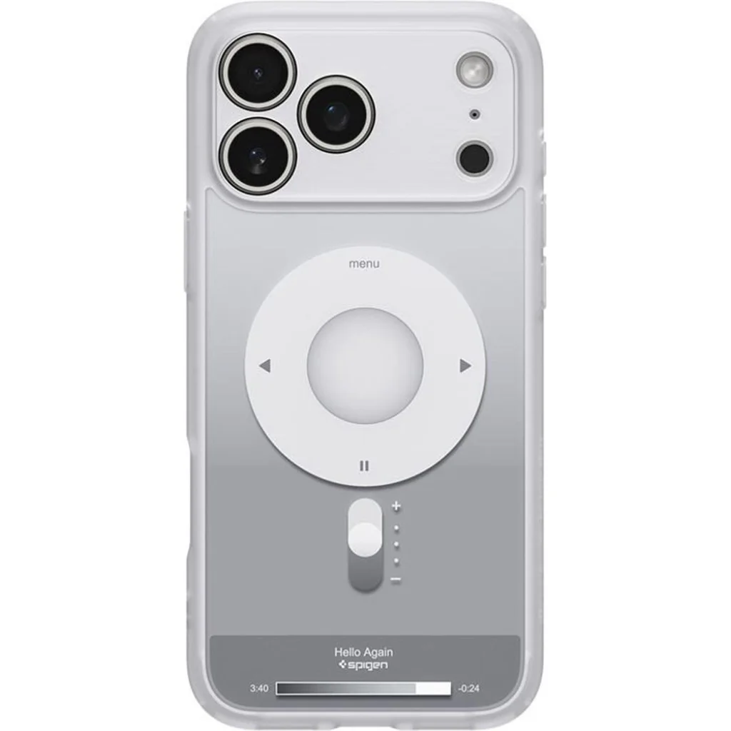 Térjen vissza a 2000-es évek ikonikus stílusához az iPhone 17 Pro Max Spigen Ultra Hybrid Classic MagSafe tokkal. A képeken is jól látható, részletgazdag grafika tökéletesen megidézi a klasszikus zenelejátszók (iPod) megjelenését. A hátlapon helyet kapott a jellegzetes "klikk kerék" a menü, lejátszás és léptetés ikonokkal, egy hangerőszabályzó csúszka, valamint a nosztalgikus "Hello Again" felirat egy lejátszási sáv kíséretében. Ez a tok nemcsak kiválóan véd, de egyedi, figyelemfelkeltő megjelenést is kölcsönöz készülékének.