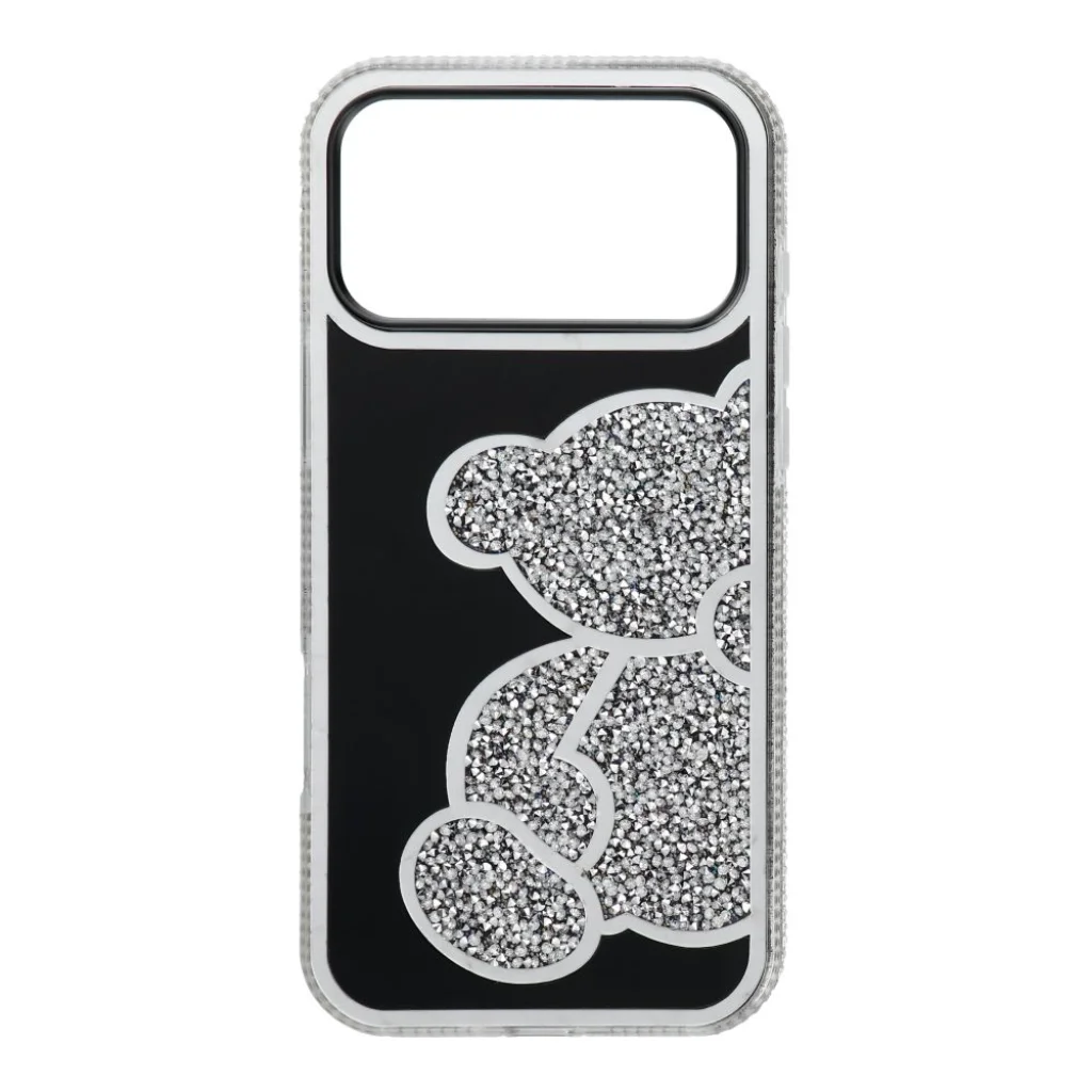 A tok legfőbb vonzereje a fekete alapon elhelyezkedő, csillogó ezüst mackó minta, melyet apró, fénylő kristályok borítanak. A mackó figurát elegáns, ezüst színű keret emeli ki, amely a kamera sziget körül is visszaköszön, egységes és prémium megjelenést biztosítva. Az átlátszó oldalsó élekbe szintén beépített apró, csillogó kövek tovább fokozzák a tok fényét és egyediségét, elegáns csillogást kölcsönözve minden mozdulatnál. A mackó karakterét a fekete, stilizált szemüveg teszi még különlegesebbé és játékosabbá.