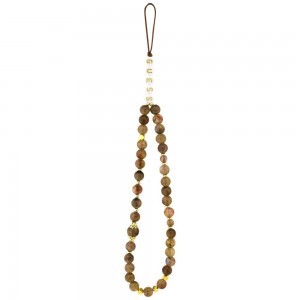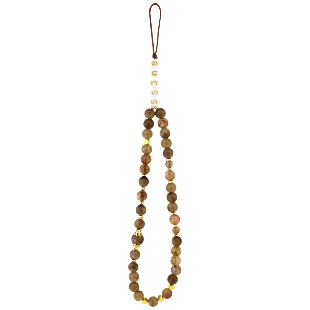 A legkülönlegesebb kiegészítő az egyedi tervezésű, gyöngyös csuklópánt, amely nem csupán egy stílusos ékszer, de praktikus megoldást is kínál telefonja biztonságos hordozására. A barna árnyalatú gyöngyök arany színű díszítésekkel vannak kiegészítve, és a "GUESS" felirat betűi elegánsan sorakoznak a pánton, ezzel is kiemelve a márka presztízsét. A pánt segítségével telefonja mindig kéznél lehet, anélkül, hogy aggódnia kellene az elejtés miatt.