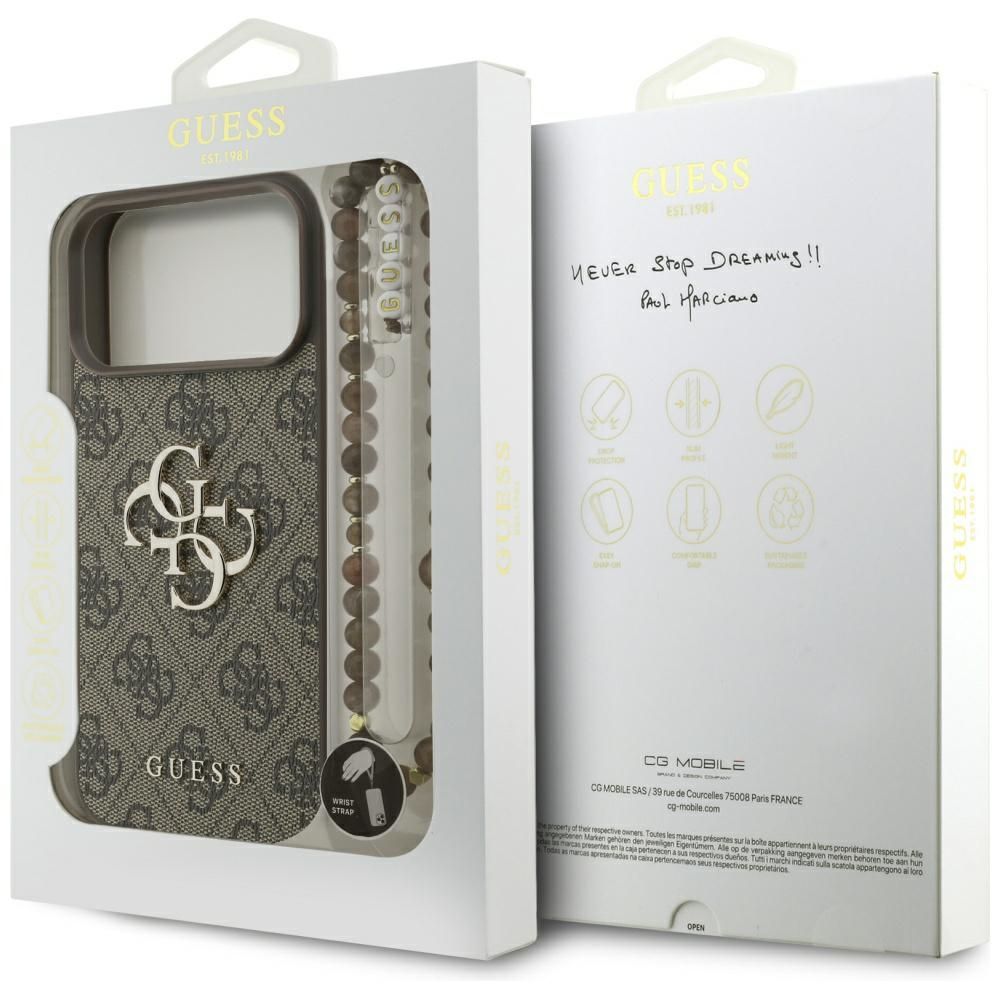 Guess 4G klasszikus logós barna tok iPhone 17 Pro Max készülékhez, elegáns pánttal