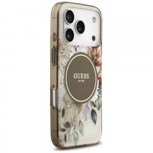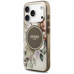 A tok átlátszó alapjára festett, gyönyörű, pasztell árnyalatú virágmintázat – levelekkel és finom barna tónusokkal – azonnal magával ragadja a tekintetet. A design középpontjában egy elegáns, barna kör alakú MagSafe gyűrű található, arany színű "GUESS EST. 1981" felirattal, amely nemcsak a márka örökségét hangsúlyozza, hanem biztosítja a MagSafe tartozékok hibátlan csatlakozását is. A tok szélei áttetsző, füstös barna árnyalatban pompáznak, harmonikusan kiegészítve a virágmintát.