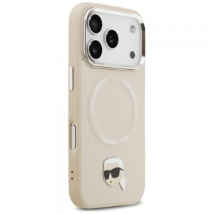 A tok elegáns bézs színben pompázik, amely időtlen eleganciát kölcsönöz iPhone 17 Pro Max készülékének. A hátlapot a legendás Karl Lagerfeld stilizált "Karl Pin" sziluettje díszíti, amely azonnal felismerhetővé teszi a terméket. A márkajelzés körkörösen, diszkréten, mégis észrevehetően helyezkedik el a MagSafe gyűrű körül, tovább erősítve a luxusérzetet.
