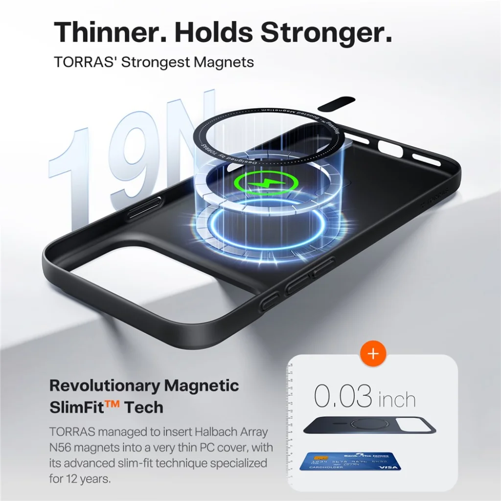 A Torras az ultra-vékony és mágneses tokok úttörője, 12 éves tapasztalattal és 93,2%-os visszavásárlási aránnyal büszkélkedhet. A forradalmi mágneses SlimFit™ technológia a rendkívül vékony PC tokba integrált N56 Halbach Array mágneseket tartalmaz, amelyek 19N húzóerőt biztosítanak – ez a Torras legerősebb mágneses megoldása. Ez a technológia garantálja a MagSafe kiegészítők tökéletes és erős rögzítését.