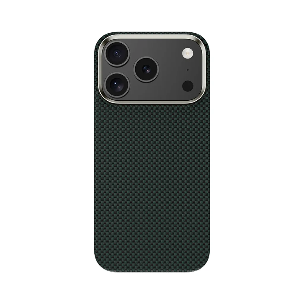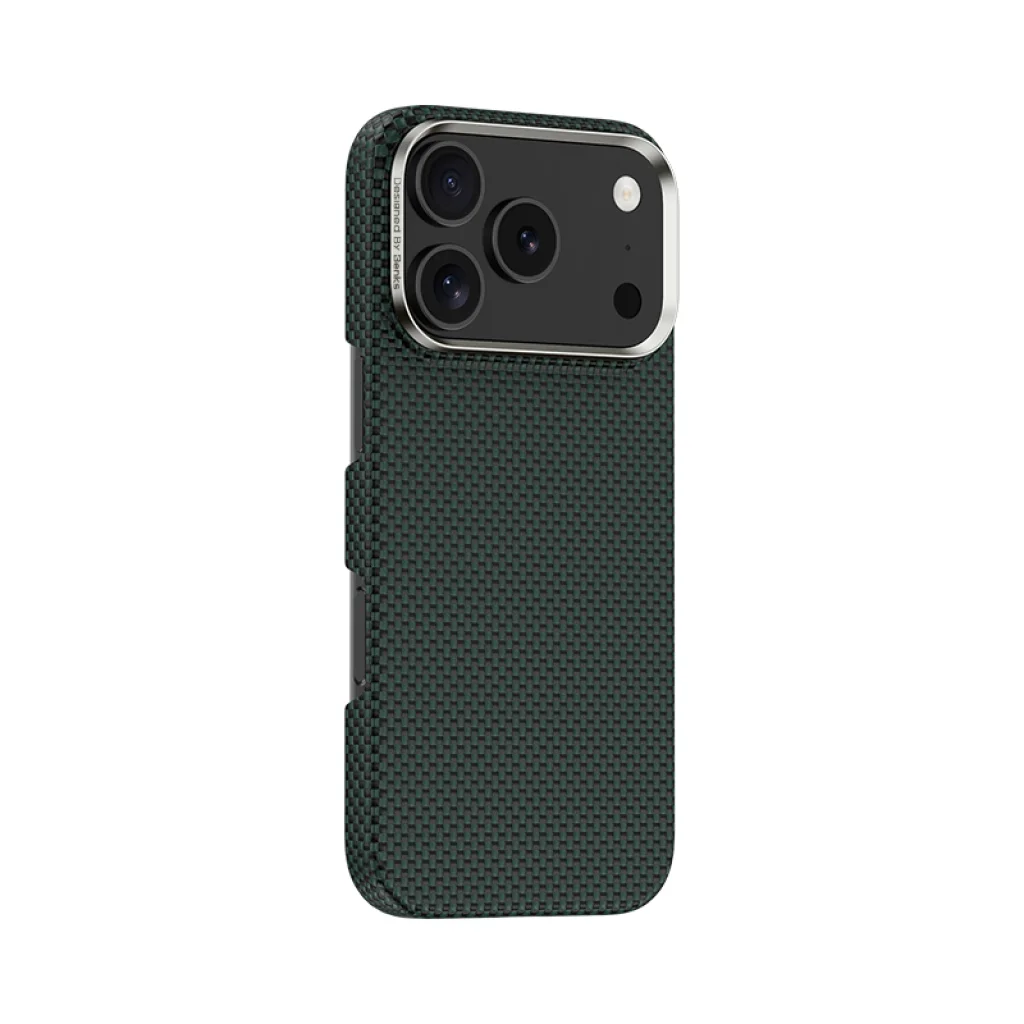 - Kifinomult 3D textúra és prémium dizájn: A zöld Kevlar® szálak egyedülálló 3D textúrát alkotnak, amely nemcsak vizuálisan vonzó, hanem kellemes tapintású és jobb, csúszásmentes fogást is biztosít. A kamera körül elegáns, fényes fémgyűrű hangsúlyozza a prémium megjelenést és extra védelmet nyújt a lencséknek.