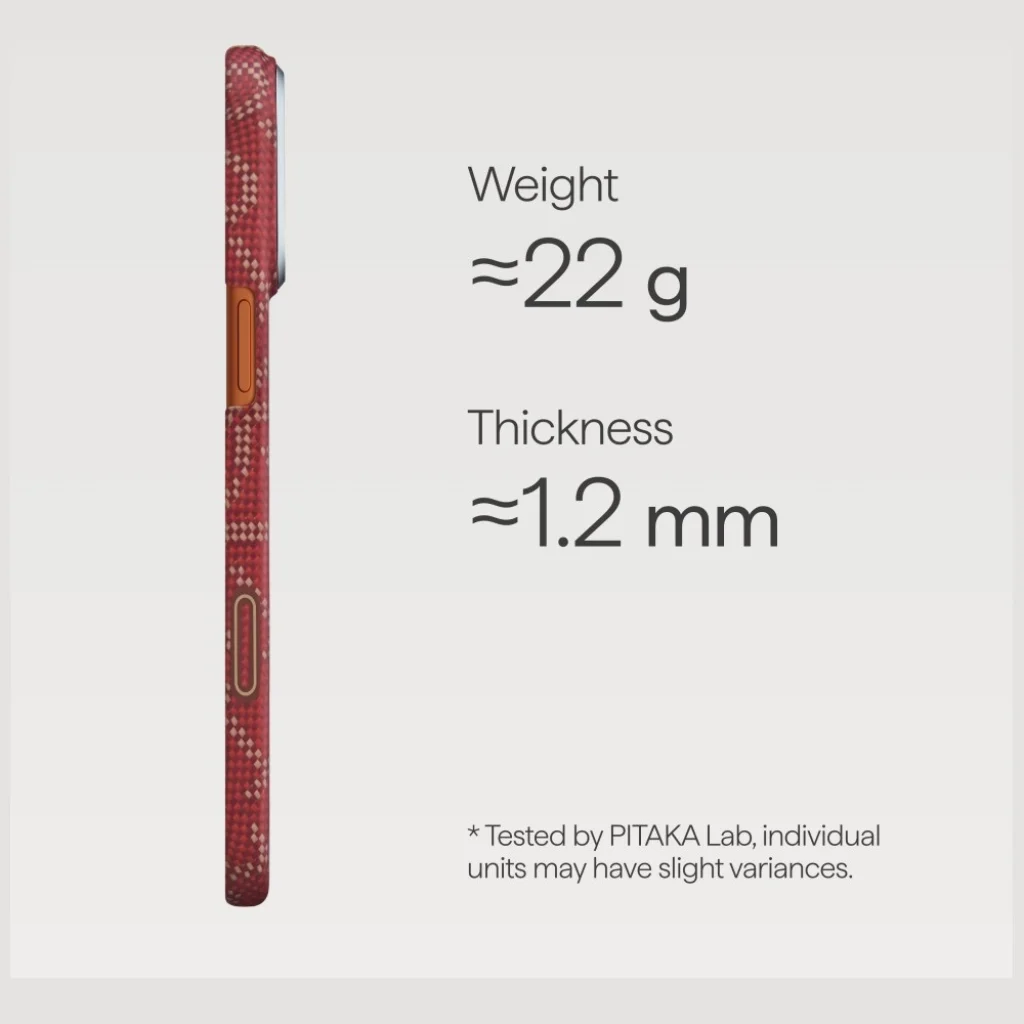 Nevéhez híven az "Ultra-Slim" tok mindössze kb. 1.2 mm vastag és kb. 22 gramm súlyú, így szinte észrevétlenül simul iPhone 17 Pro készülékére. Ez a rendkívül vékony és könnyű kialakítás biztosítja, hogy telefonja megőrizze elegáns profilját, és könnyedén becsúsztatható legyen bármilyen zsebbe vagy táskába. A PITAKA Laboratóriumában tesztelt paraméterek garantálják, hogy a védelem és a minimális tömeg közötti egyensúly tökéletes.