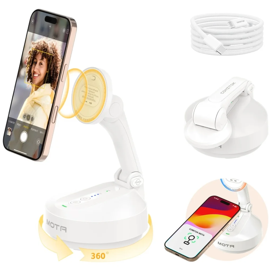 A COMITOK MOTA mágneses állvány egy innovatív, iPhone készülékekhez tervezett mágneses állvány, amely lehetővé teszi a telefon gyors és stabil rögzítését fémfelületekre vagy kompatibilis kiegészítőkhöz. Kompakt kialakítása ideálissá teszi mobilfotózáshoz, videófelvételhez és videóhívásokhoz.