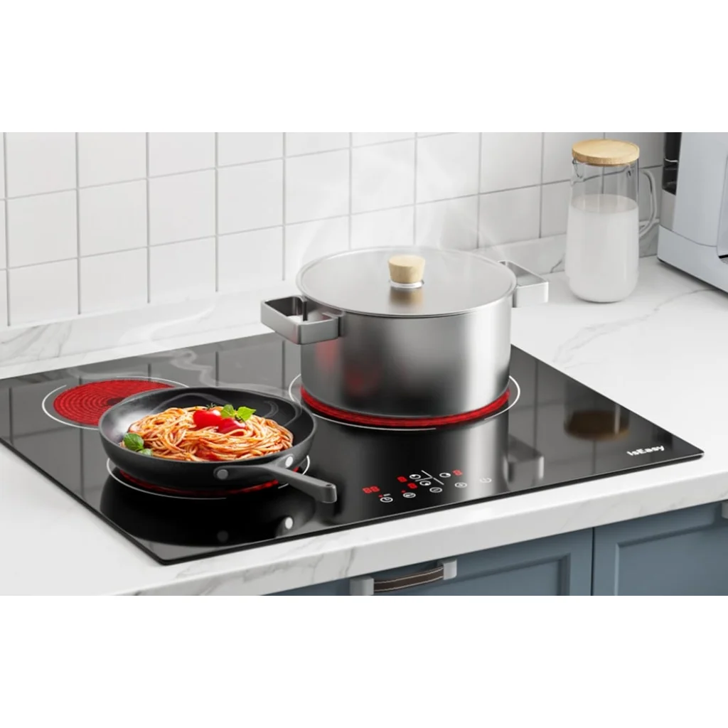 A főzőlap három fűtési zónával van felszerelve: a bal felső 1200 W-os, a bal alsó 1800 W-os és a jobb oldali 2500 W-os. Ez az elrendezés lehetővé teszi, hogy egyszerre több ételt is elkészítsen optimális energiafogyasztás mellett. A kisebb mezőn szószt melegíthet, a közepes mezőn tésztát főzhet, a legnagyobb mezőn pedig húst süthet - mindezt egyszerre.