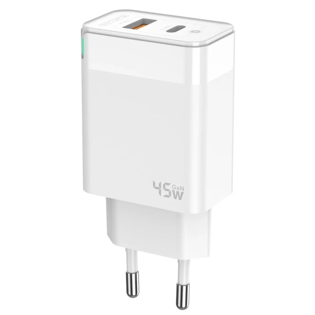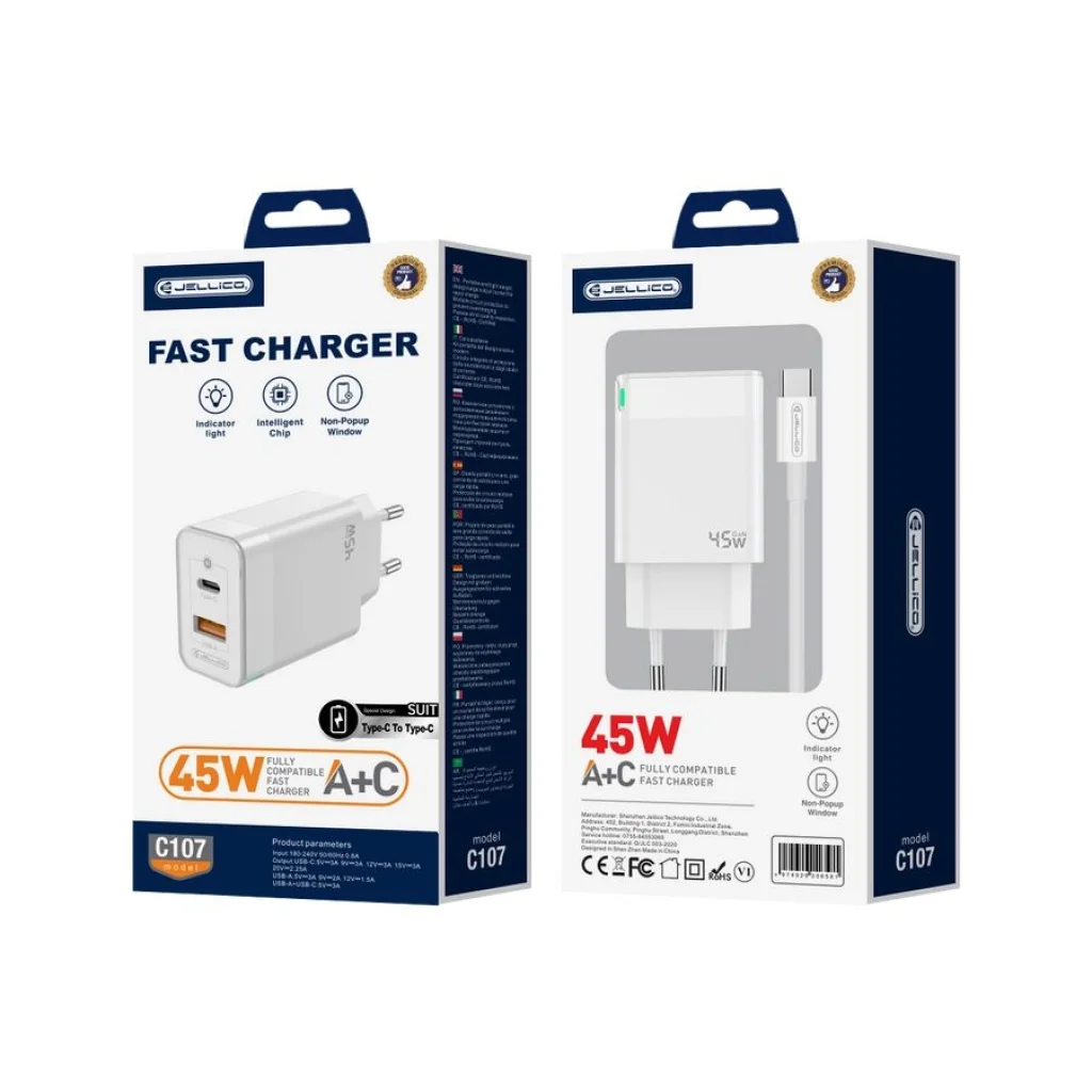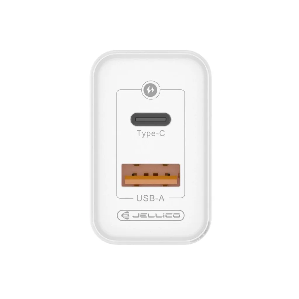 JELLICO fali töltő C107 GaN PD 45W 1xUSB-C + 1xUSB QC3.0 + kábel USB-C - USB-C Fehér
