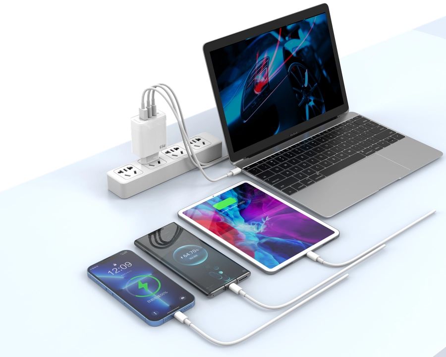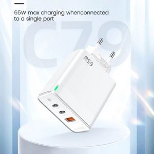 A töltő két USB-C portja és egy USB-A portja intelligensen osztja el a rendelkezésre álló energiát. Az USB-C portok Power Delivery (PD) támogatással rendelkeznek akár 65W-ig egyetlen port használatakor, míg az USB-A port Quick Charge 3.0 (QC3.0) technológiával 30W-ig képes tölteni. Így nem kell kompromisszumot kötnie a sebesség terén, még akkor sem, ha több eszközt tölt egyszerre.