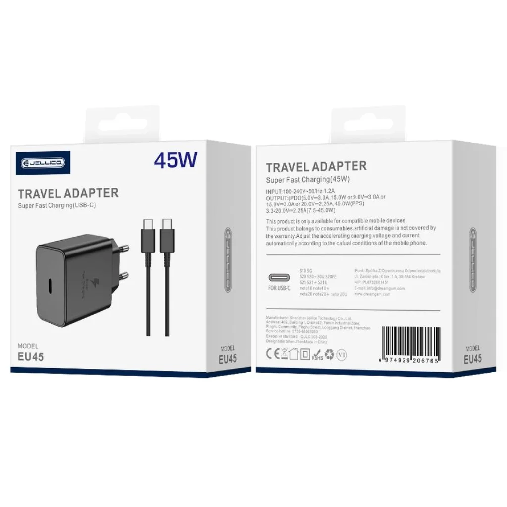 JELLICO fali töltő EU45 GaN PD 45W 1xUSB-C + kábel USB-C - USB-C Fekete,