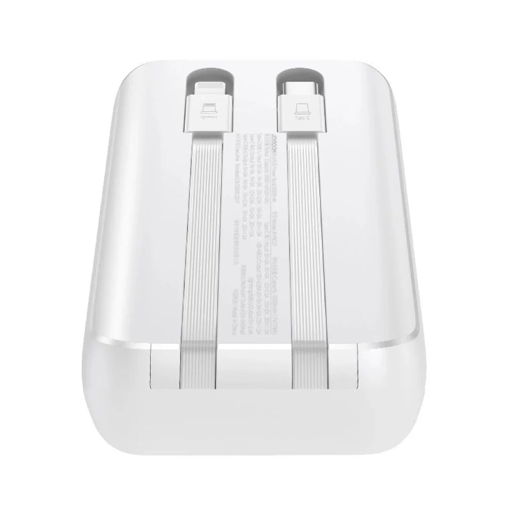 Joyroom JR-PBC07 mini powerbank 20,000 mAh kapacitással és 30W teljesítménnyel beépített USB-C és Lightning kábelekkel - fehér