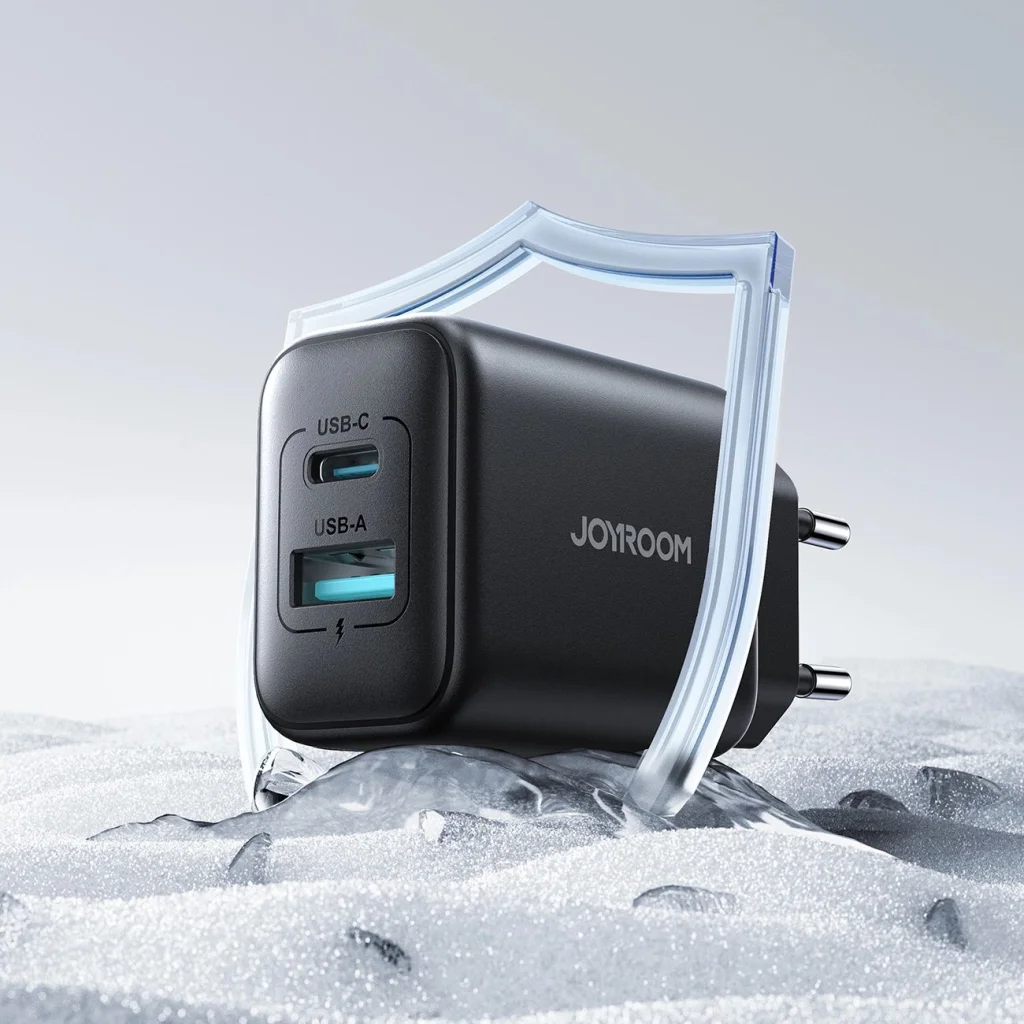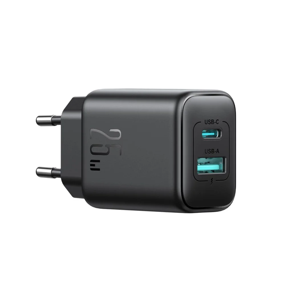 Joyroom JR-TCF13 fali töltő USB-C / USB-A portokkal, maximum 25W teljesítménnyel - fekete. Ne pazarold az időt lassú töltésre, és élvezd a teljes erőt egy szempillantás alatt! A Joyroom JR-TCF13 töltő lehetővé teszi két eszköz egyidejű gyors töltését. A Samsung Super Fast Charging (SFC) és PPS protokollok támogatása hihetetlen töltési sebességet biztosít, univerzális kompatibilitása pedig különféle okostelefon és tablet modellekkel teszi ideálissá. Emellett, a 6 pontos védelem révén eszközeid mindig biztonságban vannak töltés közben.