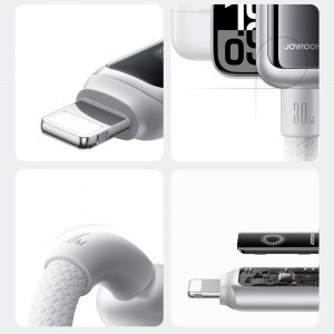 A Joyroom S-A55 StarFlight 30W USB-C - Lightning kábel intelligens és biztonságos megoldást nyújt az Apple készülékek mindennapi töltéséhez. Automatikus áramellátás megszakítással védi az akkumulátort a túltöltéstől. Beépített chipje intelligensen szabályozza a feszültséget és áramerősséget, így biztosítva a stabil, gyors és biztonságos töltést akár 30 W-ig. Színes LED kijelzője valós idejű töltési státusz jelzést biztosít. A szövött nylon, ónozott rézmag és cink ötvözetű fém elemek felhasználásával készült felépítése hosszú élettartamot garantál. Ez a kábel ideális intenzív, mindennapi használatra otthon, a munkahelyen és utazás során.