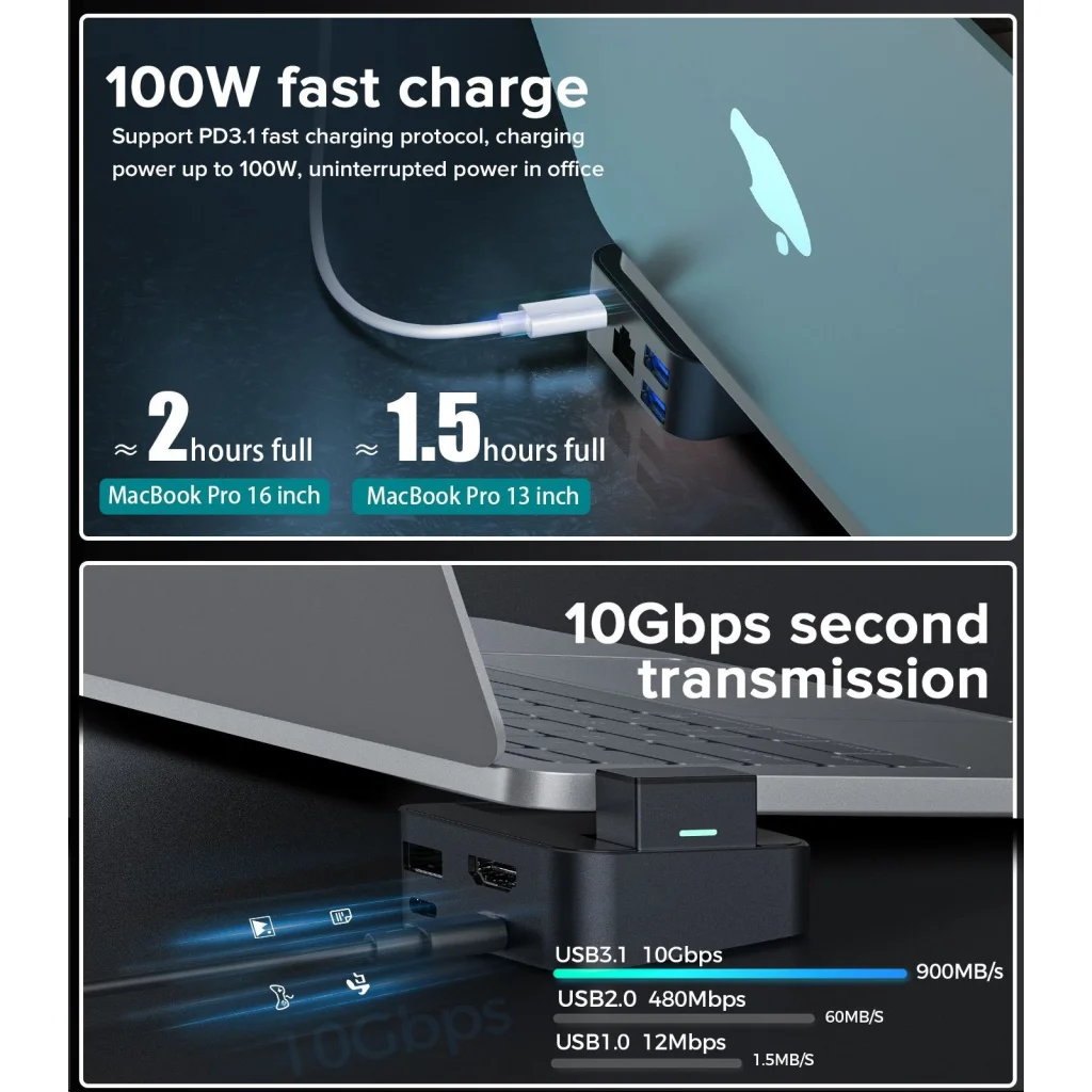 - 100W-os gyorstöltés: Támogatja a PD3.1 gyorstöltési protokollt, így a 16 hüvelykes MacBook Pro körülbelül 2 óra, a 13 hüvelykes modell pedig körülbelül 1.5 óra alatt tölthető fel teljesen, biztosítva a megszakítás nélküli tápellátást.