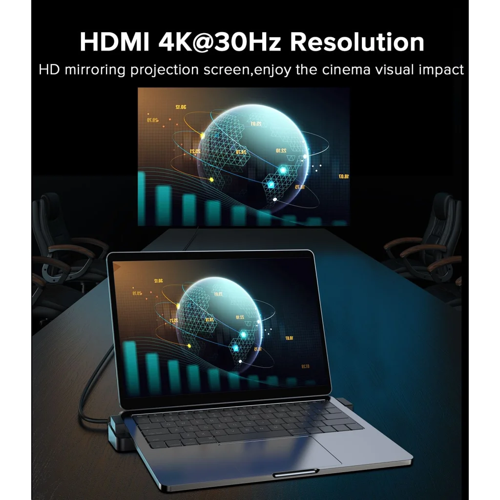 - 1x HDMI port: Támogatja a 4K@30Hz (vagy 1080p@60Hz) felbontást, így kristálytiszta képet jeleníthet meg külső monitoron, kivetítőn vagy TV-n, ideális prezentációkhoz vagy médiafogyasztáshoz.
