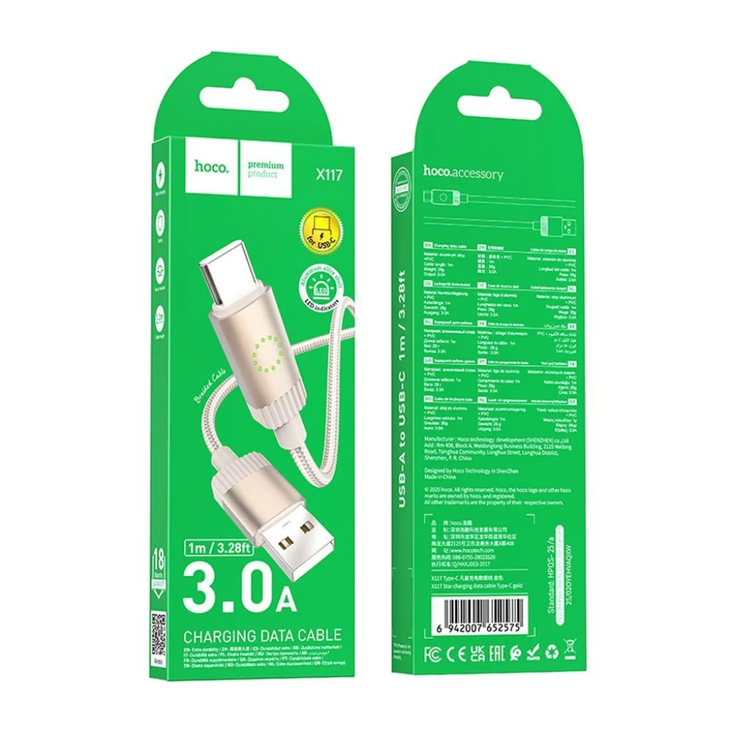 Élvezze a gyors és megbízható töltést, valamint az adatok villámgyors átvitelét a Hoco X117 USB-A – USB-C kábellel. Ez a prémium minőségű, elegáns arany színű kábel a funkcionalitás és a tartósság tökéletes ötvözete, amelyet a modern felhasználók igényei szerint terveztek.