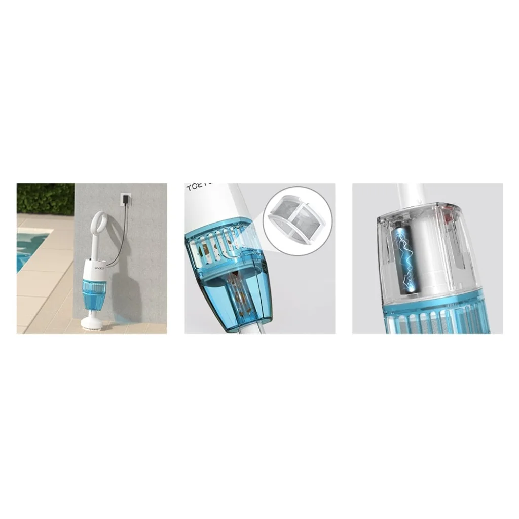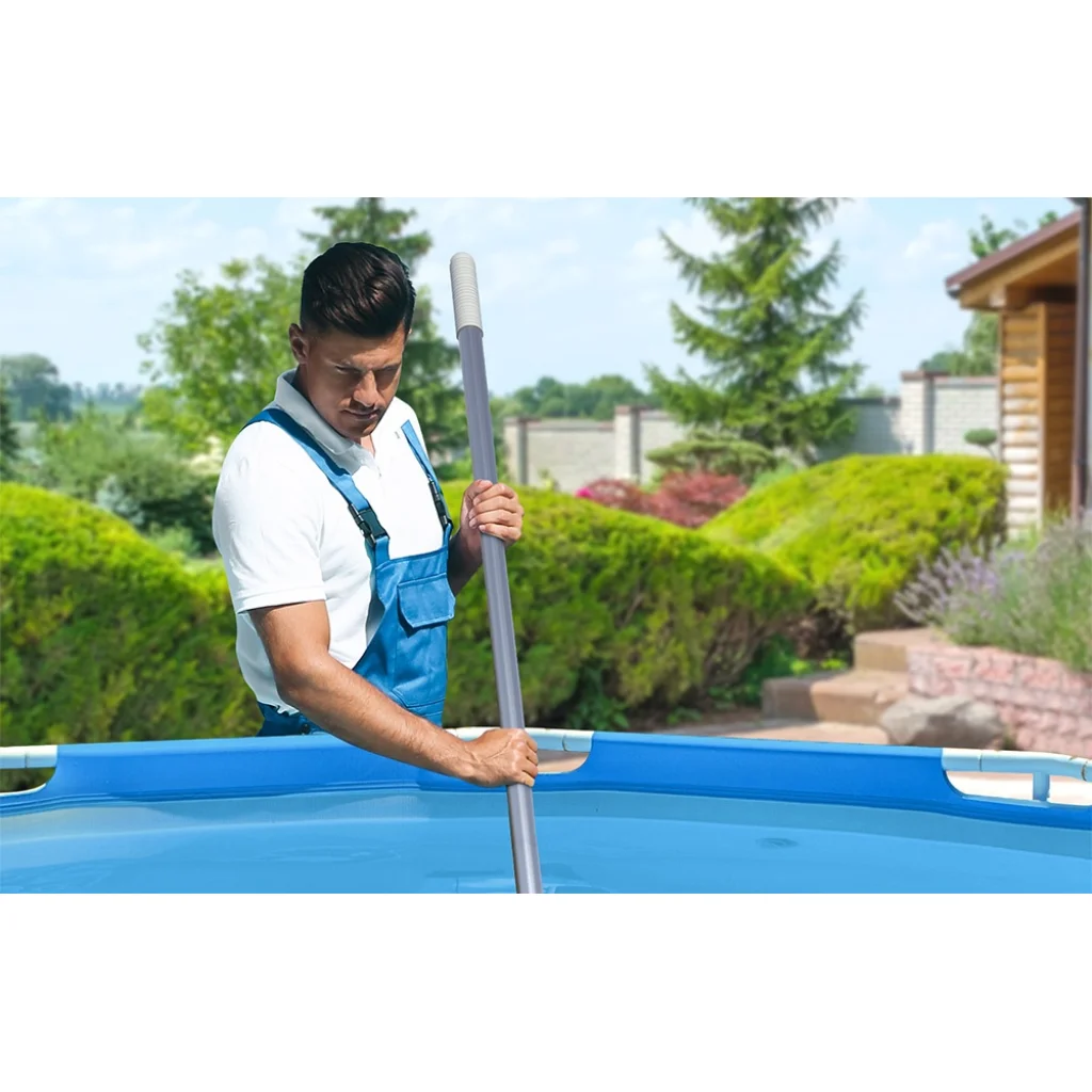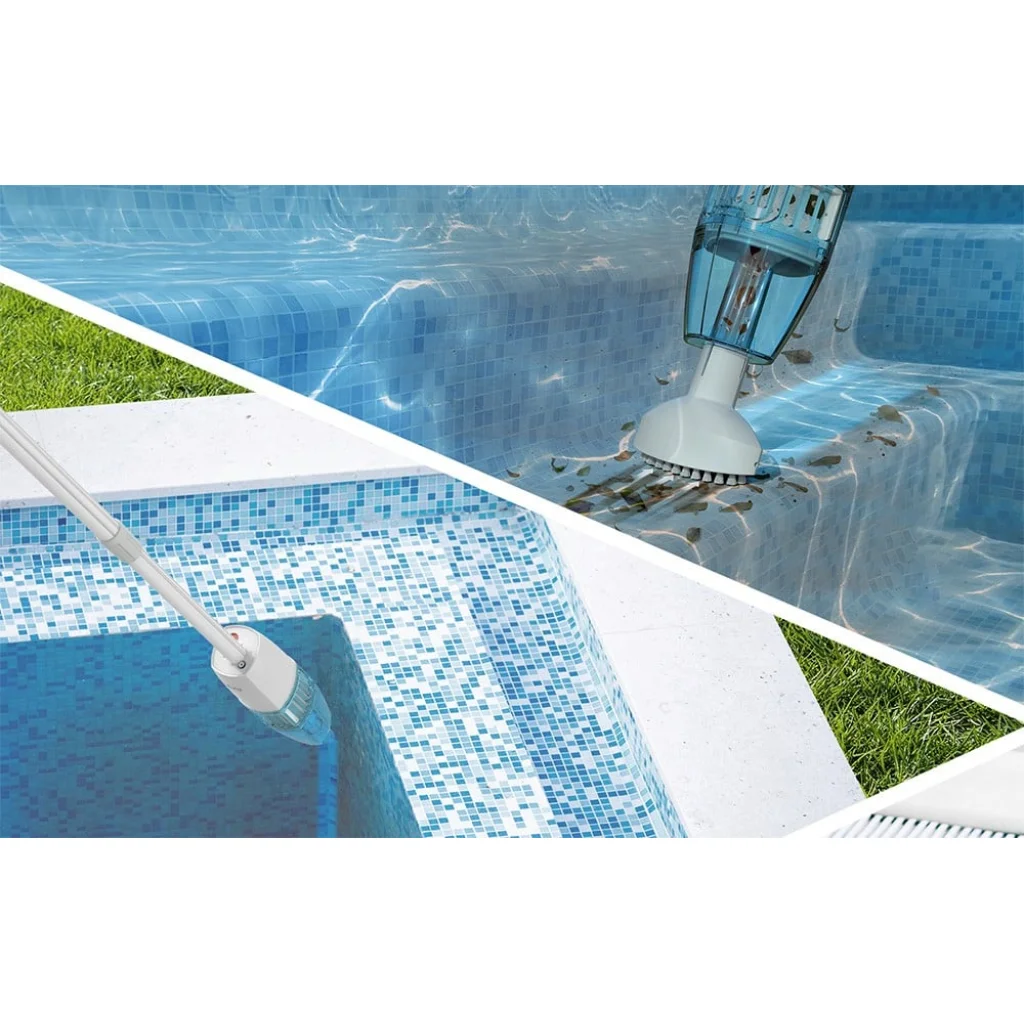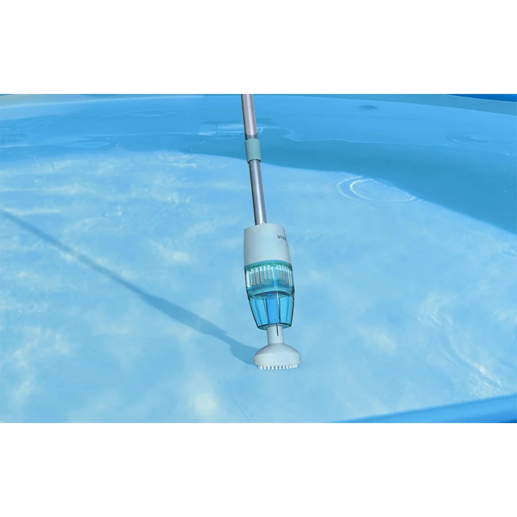Teleszkópos alumínium rúd: A porszívó teleszkópos alumíniumrúddal van felszerelve, amely akár 1,5 méterre is kinyúlik, így könnyen hozzáférhet a nehezen elérhető területekhez, mint a lépcsők, sarkok vagy medencefalak.