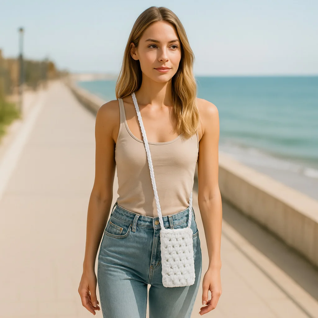 Adj bájt a nyári megjelenésedhez ezzel a bézs telefon táskával, amelyet a kézműves és lassú divat trendek inspiráltak.