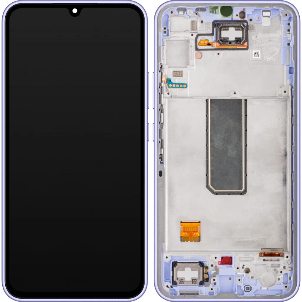 LCD kijelző modul Samsung Galaxy A34 A346 - Lila. LCD kijelző érintőképernyővel/digitizerrel és keret szerelvénnyel - eredeti szerviz alkatrész. Ha a képernyőd repedt, karcos, vagy halott pixelek, vonalak vagy vízkárok jelentkeztek, akkor ez a termék segít. Ezzel az egységgel kicserélheted a Galaxy A34 A346 teljes elülső borítást, beleértve a keretet, üveget, érintőképernyőt, LCD kijelzőt, oldalsó gombok mikroérintkezőit és oldalsó gombokat.