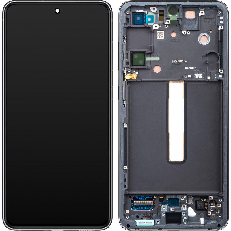LCD kijelző modul Samsung Galaxy S21 FE 5G G990 - Szürke LCD kijelző érintőképernyővel/digitizerrel és keret szerelékkel - eredeti szervizalkatrész. Ha a képernyőd törött, karcos, vagy halott pixelek, vonalak, illetve vízkárok találhatók rajta, akkor ez a termék segít neked. Ezzel az egységgel cserélheted SM-G990B Galaxy S21 FE 5G teljes elülső borítást, beleértve a keretet, üveget, érintőképernyőt és LCD kijelzőt.