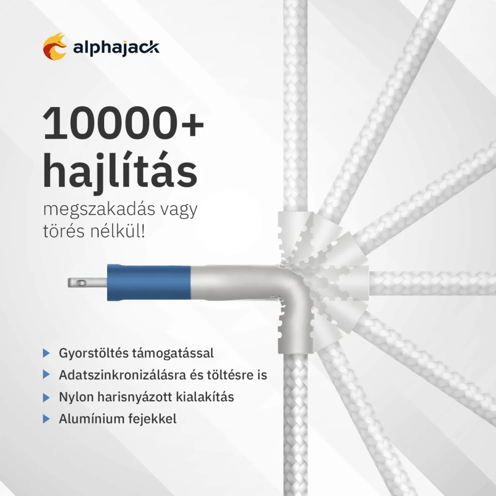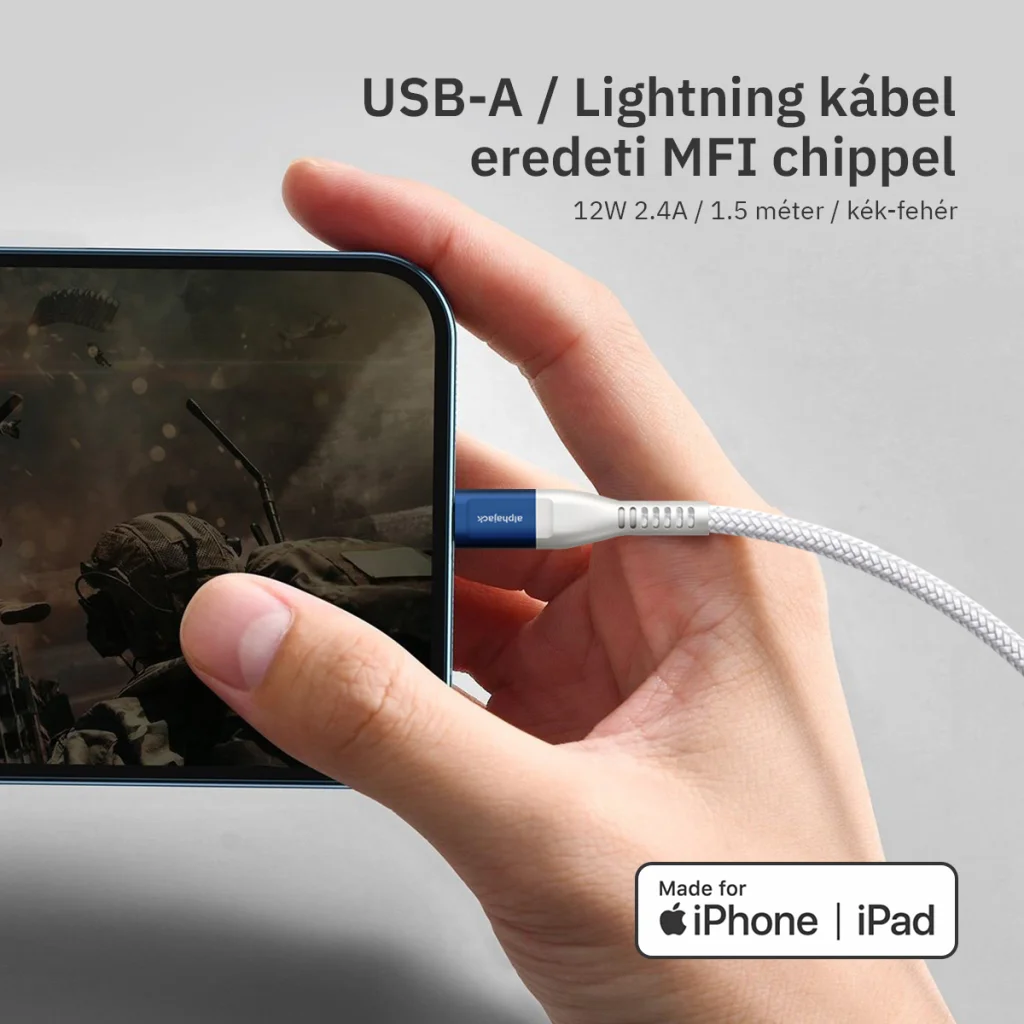 Lightning kábel 1.5m USB-A fejjel Alphajack (AL15-BW) kék/fehér színben, gyorstöltés támogatással. Törésbiztos nylon harisnyázott kialakítás, így hossztávon is megbízható működés várható. A kábel használható töltésre és szinkronizálásra is. Apple MFi (Made for iPhone, iPad) tanúsítvánnyal rendelkezik, aminek a hasznosságáról lentebb olvashatsz.