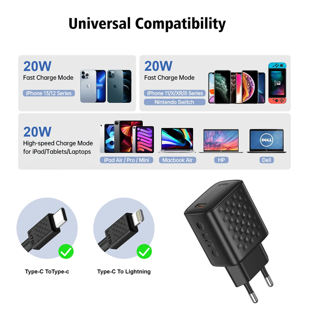 - Ne aggódjon a kompatibilitás miatt! Ez a töltő szinte minden modern eszközzel működik a Type-C portjának és a mellékelt Type-C-Lightning kábelnek köszönhetően.
