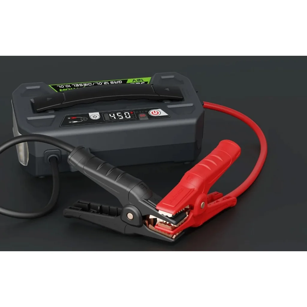 A LOKITHOR J5000 PRO 99,84 Wh kapacitású, 5000 A csúcsáramú indítóberendezés, amely akár 12,0 literes benzinmotorok és 10,0 literes dízelmotorok indítására is alkalmas. Modern LiFePO4 akkumulátorral rendelkezik, amely hosszú élettartamot, nagy stabilitást és biztonságos működést biztosít. A CONNECTMAX technológia automatikusan optimalizálja az akkumulátorhoz való csatlakozást, míg a 100 W-os PD gyorstöltés lehetővé teszi a teljes feltöltést akár 60 perc alatt. A készülék egyszerre használható bikázóként, power bankként és LED-es zseblámpaként, így sokoldalú és megbízható társ bármilyen helyzetben.