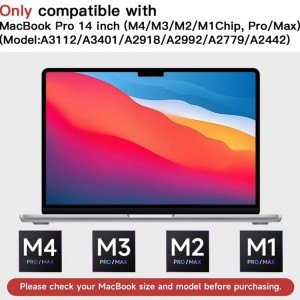 Ez a Techsuit VisionProX kijelzővédő fólia kizárólag a 14 hüvelykes (valós kijelzőméret: 14.2 hüvelyk) MacBook Pro modellekkel kompatibilis. Kérjük, vásárlás előtt győződjön meg arról, hogy készüléke az alábbi típusok közé tartozik: