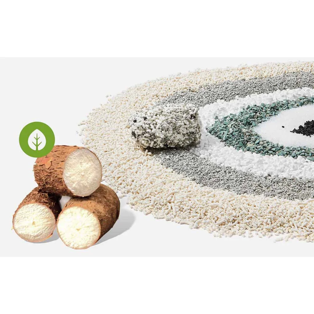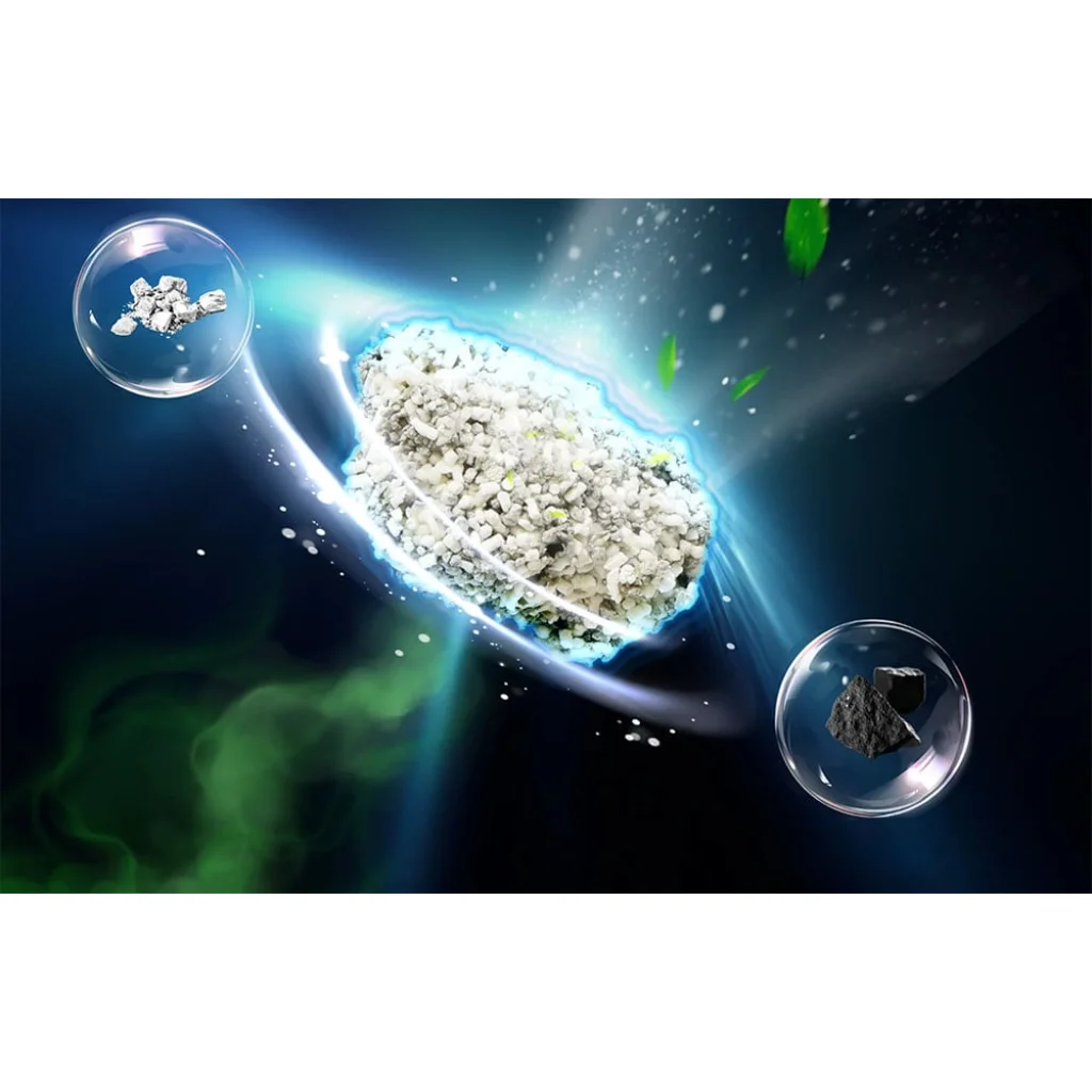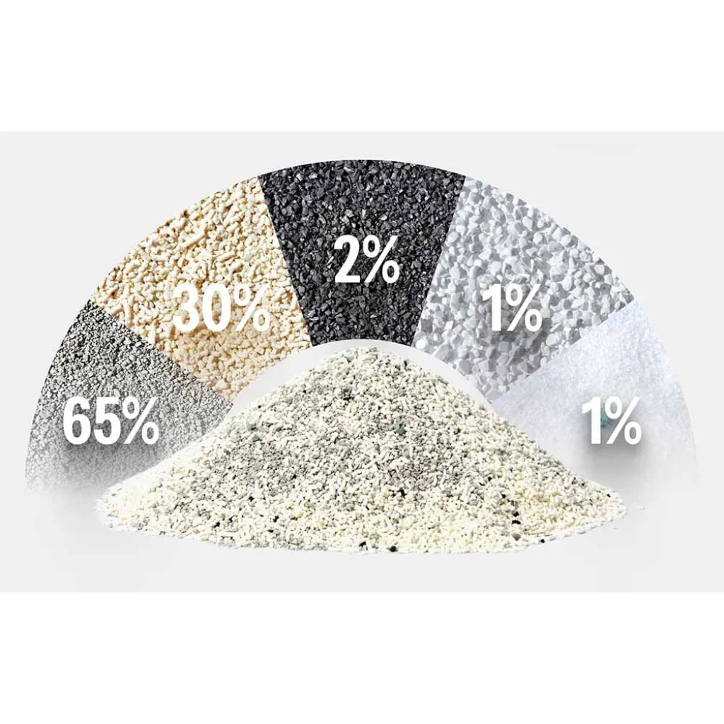 A Catlink vegyes alom 65%-ban bentonitból és 30%-ban tápiókából áll, valamint hozzáadott aktív szenet, szódabikarbónát és szilikagélt tartalmaz. Szagtalan és természetes összetételének köszönhetően biztonságos a macskák és az emberek számára egyaránt. Ez a keverék 99%-kal kevesebb port is termel, mint a hagyományos termékek, ami megakadályozza, hogy a por a levegőbe kerüljön, és minimálisra csökkenti a légúti irritáció kockázatát. Ugyanakkor a szódabikarbóna hozzáadása fertőtlenítő hatású, semlegesíti a baktériumokat és csökkenti a kellemetlen szagok kialakulásának kockázatát.