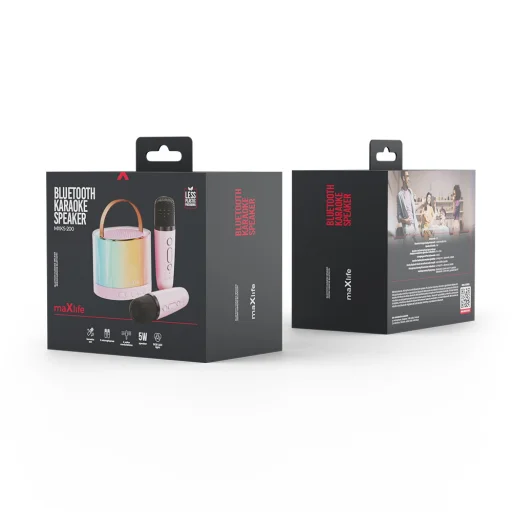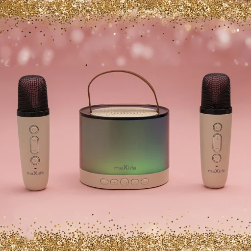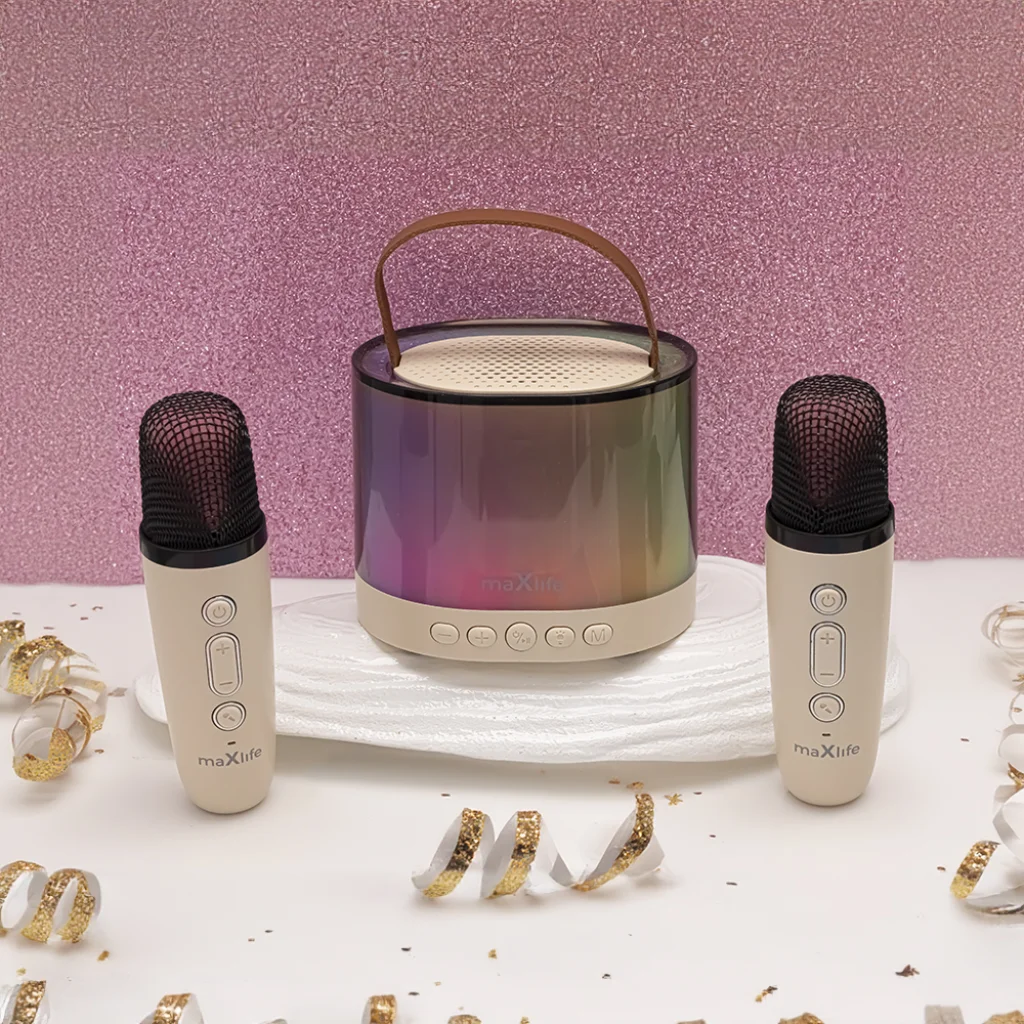 A Maxlife MXKS-200 Bluetooth Karaoke Szett tökéletes megoldás bármilyen bulira, garantálva a nagy szórakozást és felejthetetlen zenei élményeket. Funkcionalitásának és mobilitásának köszönhetően a szett megbízható társ bármilyen eseményen. Az 5W hangszóró mély és tiszta hangzást biztosít, míg a 1500 mAh lítium-polimer akkumulátor lehetővé teszi a folyamatos zenelejátszást körülbelül 5 órán keresztül.