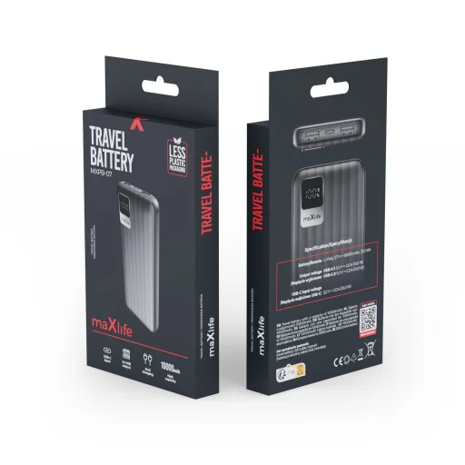 A Maxlife power bank MXPB-07 10000 mAh fekete színű készülék megbízható energiaszükségletet biztosít útközben. A 10000 mAh kapacitás elegendő több mint egy töltésre. Ez a Maxlife MXPB-07 power bank különösen hasznos, ha okostelefonod vagy más mobil eszközöd energiára szorul távol a konnektortól. A kapacitás elegendő két teljes töltéshez a legtöbb telefon számára, anélkül, hogy azonnal vissza kellene tölteni a power banket.