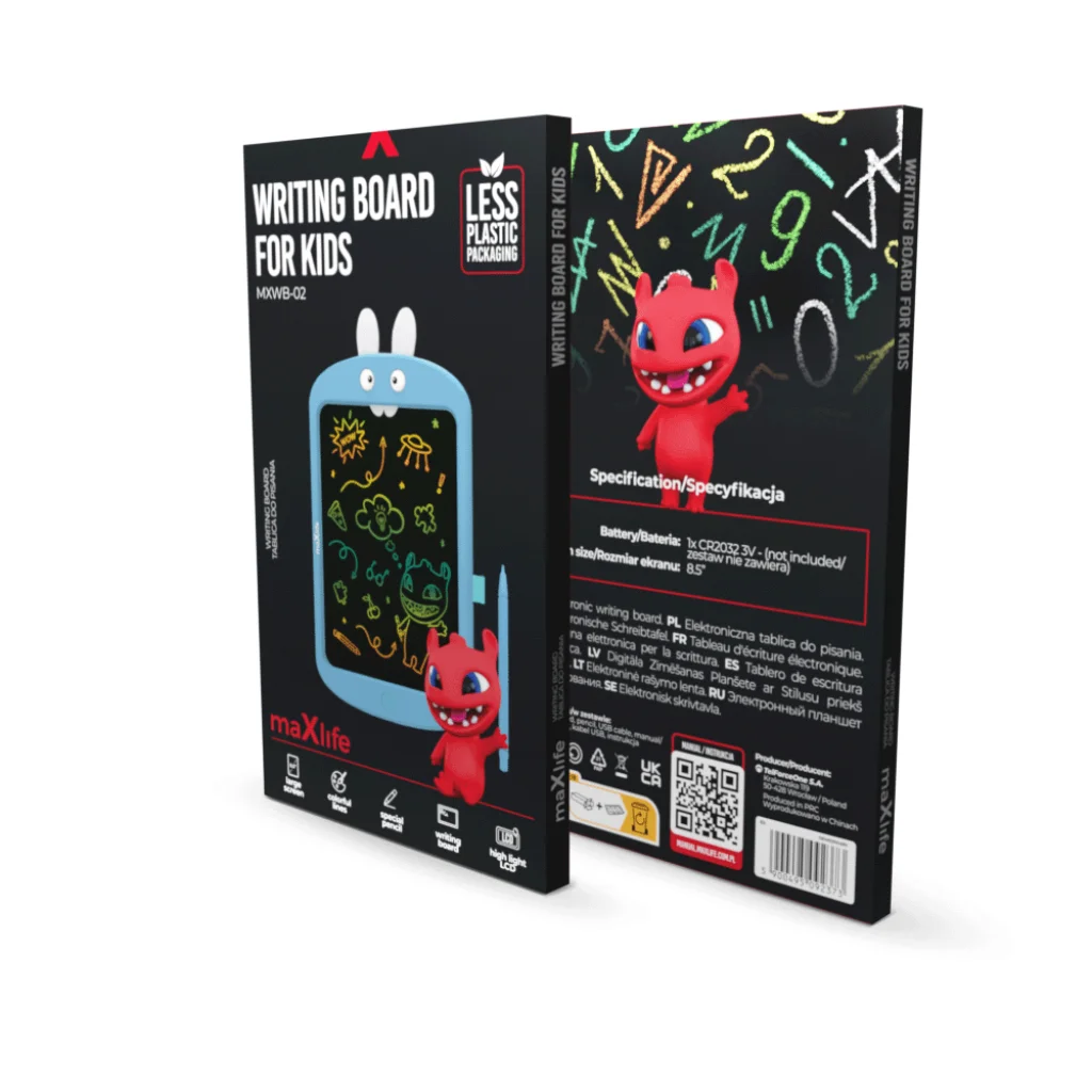 A MXWB-02 Maxlife gyerek íróasztal egy különleges eszköz, amelyet kifejezetten gyermekek számára terveztek. Praktikus és szórakoztató dizájnnal rendelkezik, beleértve nyúlmókus füleket és mozgó szemeket. A készlet tartalmaz egy tollat, amely megkönnyíti az egyszerű és precíz írást és rajzolást az asztalon. Az asztal úgy működik, mint egy tablet, mert reagál a toll mozgására, így a gyermekek papír vagy hagyományos festék nélkül is készíthetnek rajzokat. Az asztal zárolható, és a rajzokat egy gombnyomással törölhetik. A nagy képernyő felület és a színes vonalak kreatív alkotáshoz biztosítanak helyet. Az íróasztal pormentes, biztonságos a gyermekek szeme számára, hordozható, könnyű, és otthoni használatra vagy utazásra is alkalmas.