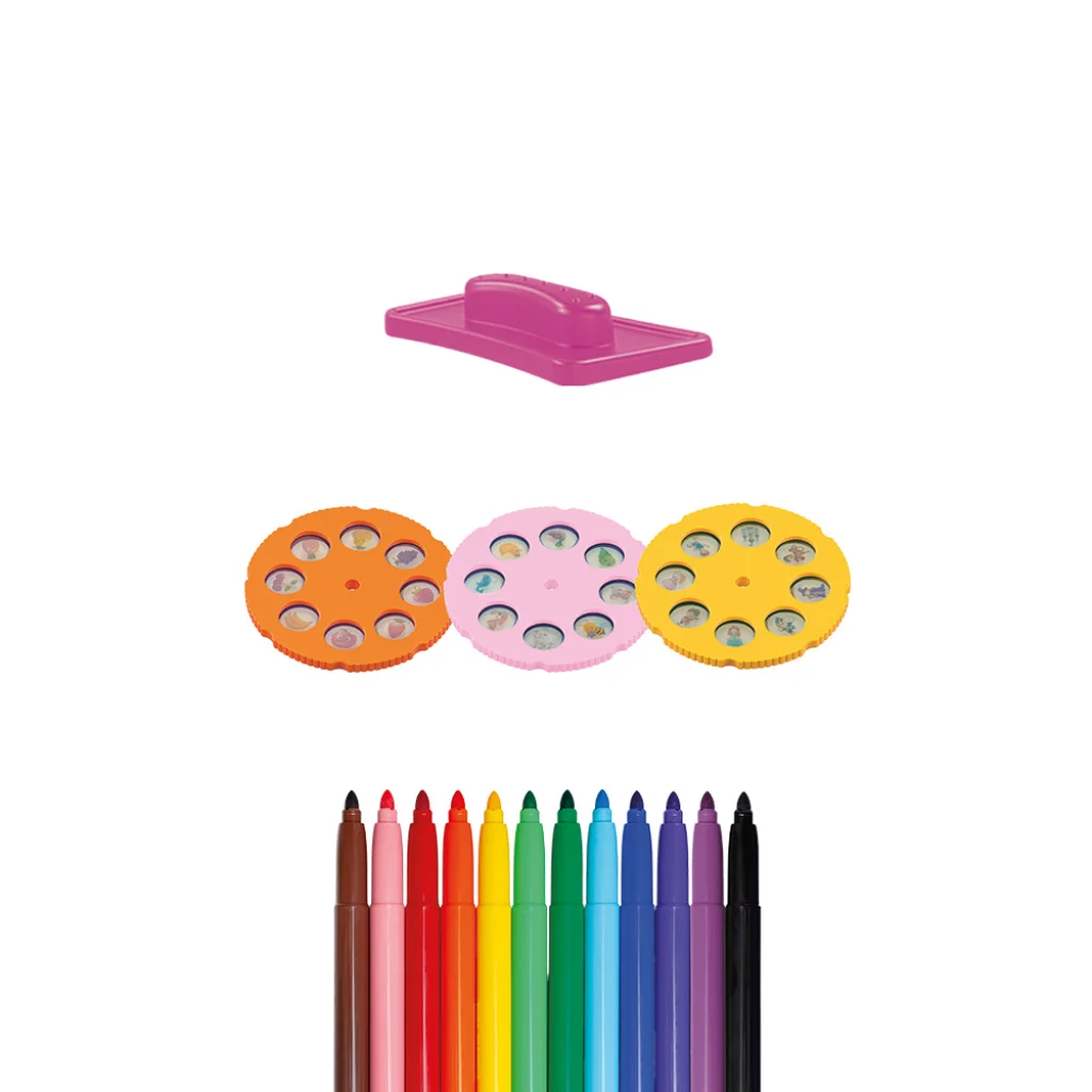 A készlet tartalmaz 12 filctollat és egy könyvet, amely tovább ösztönzi a játékot. Az eszköz serkenti a kreativitást, tanítja a színek megkülönböztetését, és támogatja a motoros készségek fejlődését. A projektor világítása felhívja a figyelmet, és állítható karja lehetővé teszi a testreszabást a művész preferenciái szerint.