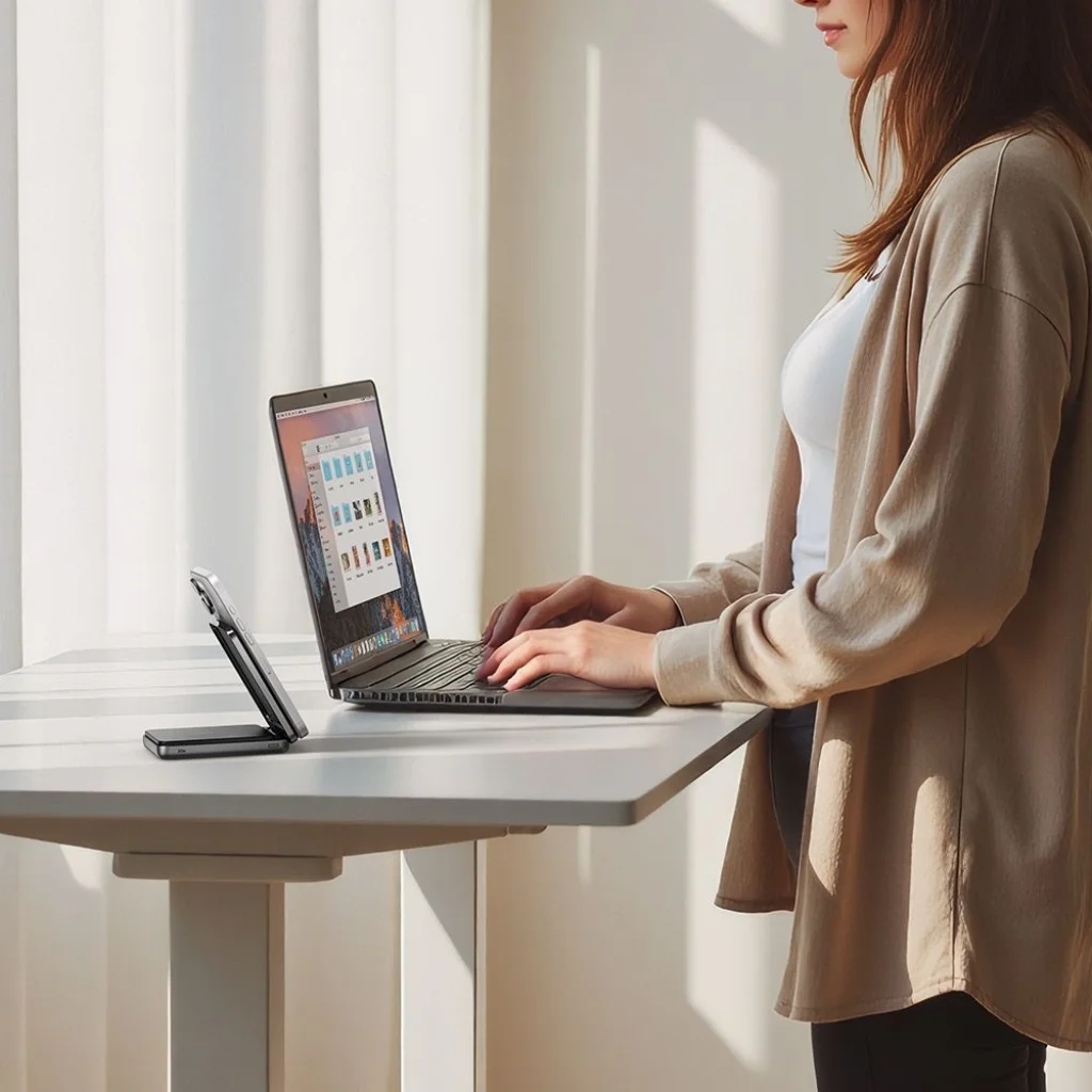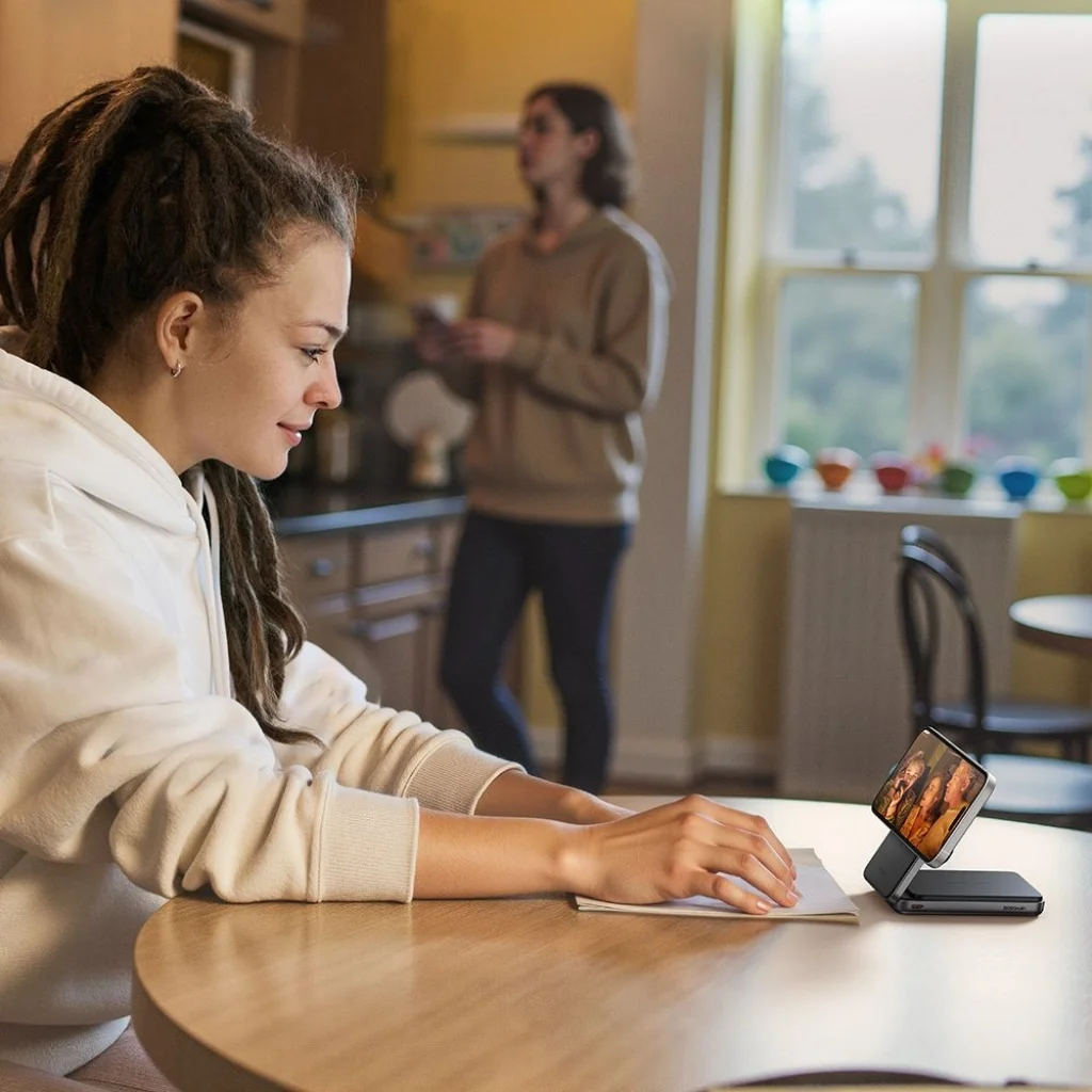 - Két funkció egyben: Vezeték nélküli Qi2 töltő és állítható telefontartó.