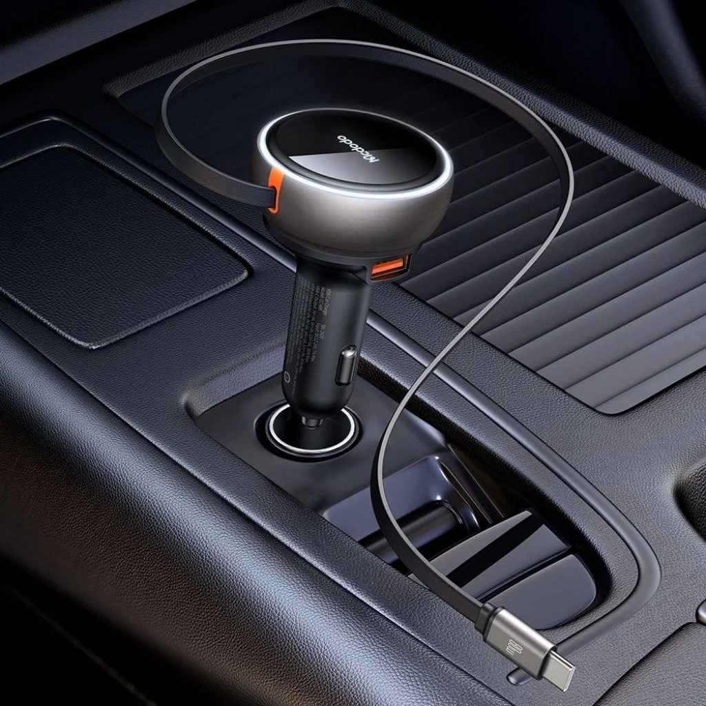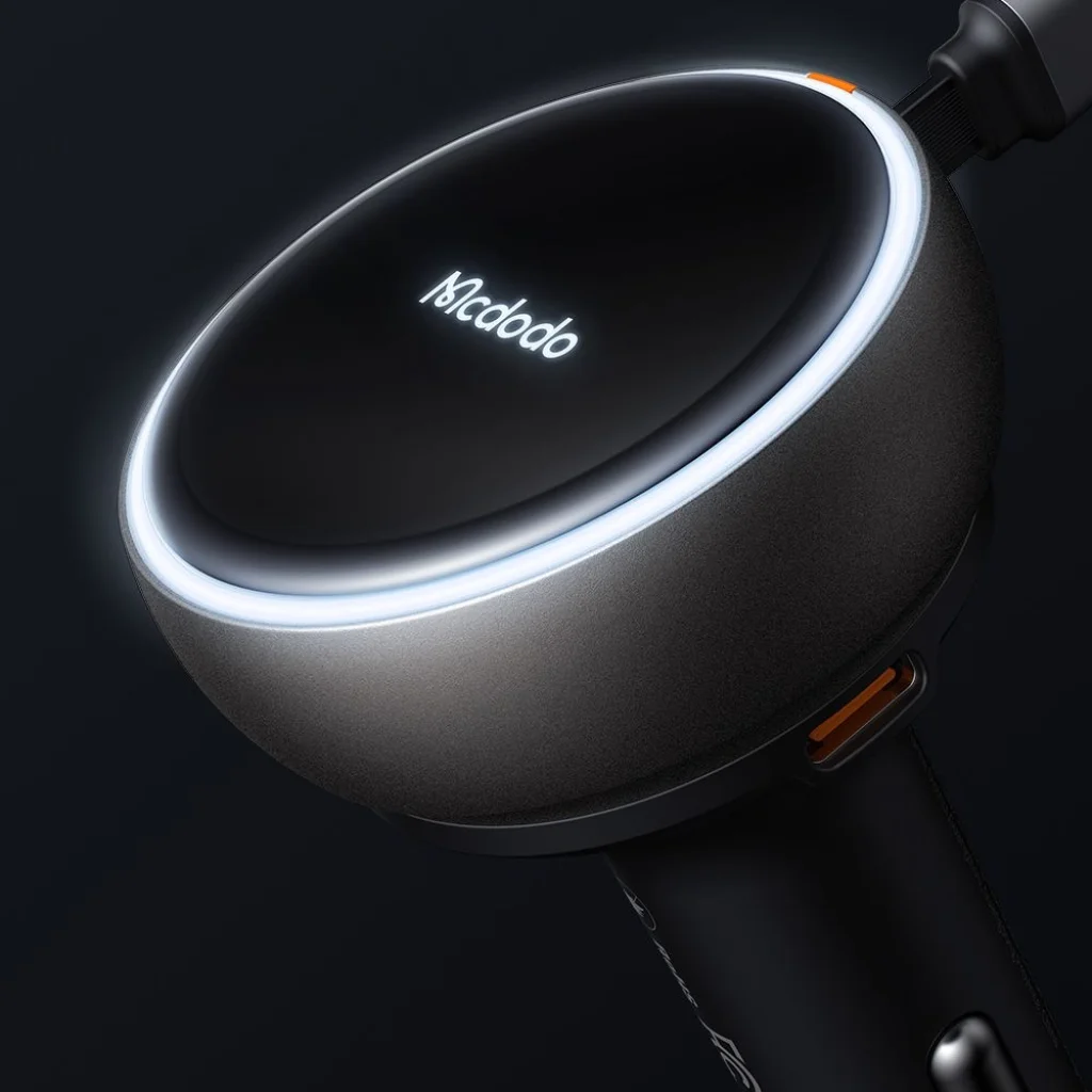 Ez a töltő nem csak funkcionális, hanem rendkívül stílusos is. A fekete színű, prémium cinkötvözet ház elegáns, minimalista megjelenést kölcsönöz, amely tökéletesen illeszkedik a modern autók belső teréhez. Az anyagválasztás nem csak esztétikai, hanem praktikus is: a cinkötvözet kiválóan ellenáll a mindennapi használatnak és hatékonyan vezeti el a hőt, biztosítva a hosszú élettartamot és a stabil működést. A tetején található jelzőfény gyűrű és a Mcdodo logó diszkrét, de figyelemfelkeltő világítást biztosít a sötétben, jelezve a töltő működését.