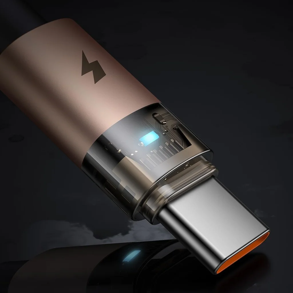 - Átlátszó csatlakozó töltésjelző fénnyel: Az USB-C csatlakozó egyedi, átlátszó kialakítása láthatóvá teszi a belső áramkört, és egy beépített kék LED töltésjelző fénnyel értesít az eszköz töltöttségi állapotáról. Ez a funkció különösen hasznos sötétben, és modern, futurisztikus megjelenést kölcsönöz a kábelnek.