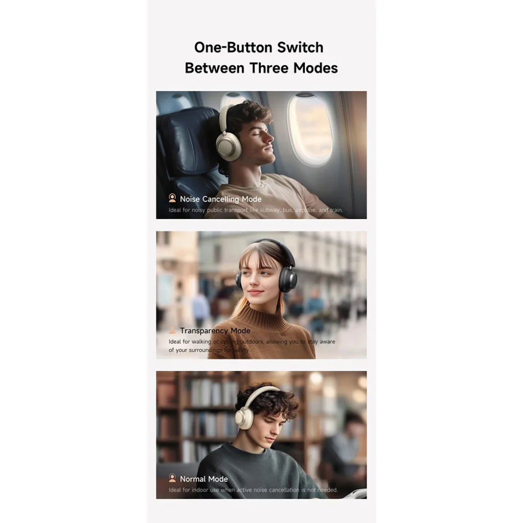 - Három intelligens üzemmód: Válts könnyedén az Aktív zajszűrés (ANC), a Transzparencia (Transparency) és a Normál (Normal) mód között egyetlen gombnyomással.