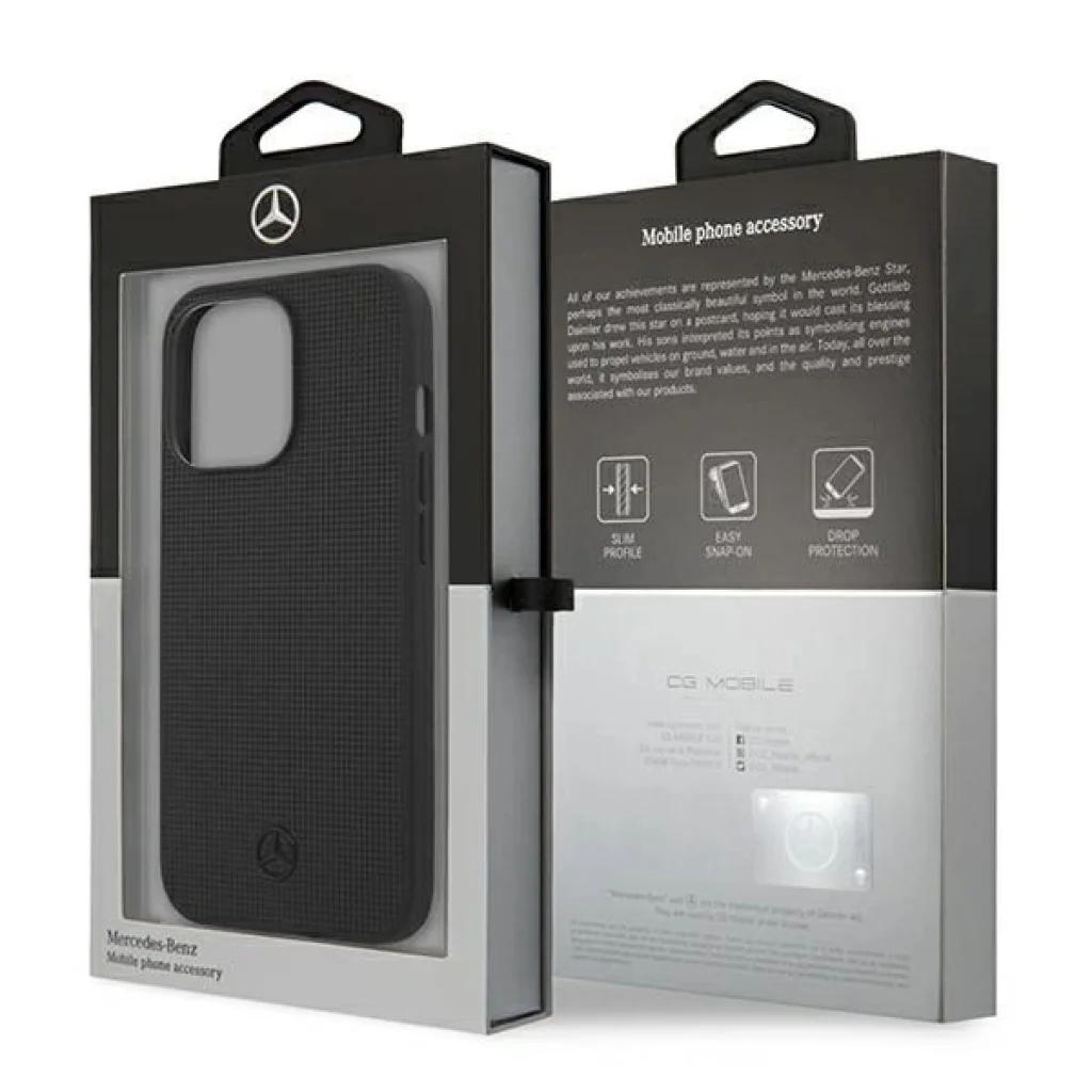 A Mercedes-Benz belsőépítészeti lenyűgöző esztétikáját valódi bőr tok formájában valósították meg. A Mercedes-Benz tok perforált bőrrel és fém logóval a legmagasabb szintű kényelmet biztosítja a használat során. A bőr burkolat a Mercedes-Benz fémes logójával klasszikus és elegáns megjelenést kölcsönöz, valamint garantálja a telefonod biztonságát.