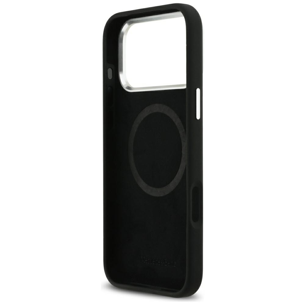 Mercedes-Benz Szilikon Retro Logós MagSafe tok A Mercedes-Benz autók belső dizájnjára jellemző lenyűgöző esztétika részletesen átkerült a kiváló minőségű szilikonból készült Szilikon Retro Logós MagSafe tokra. Ez nemcsak a márkára jellemző részletekre való odafigyelés eredménye, hanem egy modern megközelítés kifejeződése is, tartós és környezetbarát anyagok felhasználásával. Tökéletes választás az összes MagSafe technológiával rendelkező készülék tulajdonosának. Egyedi megjelenés és kivételes minőség Az exkluzív Mercedes Szilikon Retro Logós MagSafe tok elegancia, osztály és modern stílus kombinációja. A tok hátulja kiváló minőségű folyékony szilikonból készült, amely kellemes tapintású, karcálló, és biztos fogást nyújt használat közben. A hátulját két jellegzetes márkalogó díszíti—egy dombornyomott Mercedes-Benz logó középen, és egy ezüst logó a tok alján—amely különleges, luxus hangulatot kölcsönöz az kiegészítőnek. A precíz kivágások és pontosan illeszkedő oldalsó gombok kiegészítik a dizájnt, hangsúlyozva a részletekre való odafigyelést és a legmagasabb minőségű kidolgozást. A tok a MagSafe rendszert tartalmazza, amely biztosítja a teljes kompatibilitást az Apple mágneses kiegészítőkkel. Ez a tökéletes funkcionalitás, védelem és kifinomult dizájn kombinációja, amely megőrzi az iPhone biztonságát és elegáns, időtálló megjelenést kölcsönöz neki. Szilárd szerkezet és tökéletes illeszkedés A gondosan kiválasztott méreteknek köszönhetően a tok hatékonyan elnyeli az ütéseket, miközben teljes hozzáférést biztosít a portokhoz és gombokhoz. A tok oldalai rugalmasak, így könnyű az összeszerelés és szétszerelés, de mindenekelőtt tökéletesen védik a készülék keretét a behatások vagy potenciális sérülések ellen. Az enyhén megemelt külső élek megóvják a telefon képernyőjét a sérülésektől, míg a kamera lencséje körüli megemelt külső élek megóvják az optikát a törésektől vagy karcolásoktól. Vezeték nélküli töltés A tok tartalmaz egy mágneses gyűrűt, amely kompatibilis a MagSafe vezeték nélküli töltővel, biztosítva a gyors és egyszerű töltést. A tok beépített mágnesei tökéletesen igazodnak a felhasználó telefonjához, és biztosítják az erős kapcsolatot a MagSafe töltővel. A tokot a Mercedes-Benz engedélyével gyártották. Műszaki adatok Mercedes Szilikon Retro Logós MagSafe Gyűjtemény Típus Kemény tok Anyag Szilikon Szín Fekete Kompatibilitás iPhone 17 Pro Max