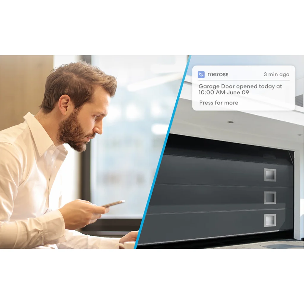 Meross alkalmazás - élvezze a távvezérlést. Frissítse fel hagyományos garázskapu működtető rendszerét ezzel a praktikus kapcsolóval. A Meross alkalmazással párosítva rengeteg hasznos képességet biztosít. Távolról nyithatja, zárhatja és felügyelheti garázsát, és értesítéseket kaphat, ha a garázskapu kinyílt vagy bezáródott. Előfordul, hogy elfelejti bezárni a garázst? Ne aggódjon! Ha túl sokáig marad nyitva vagy lefekvéskor, a Meross értesíti Önt.