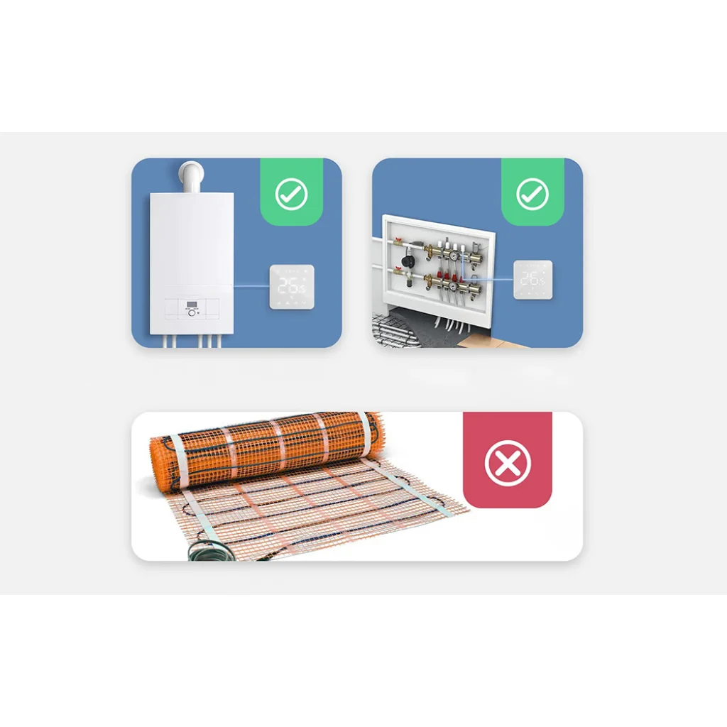 Figyelem: A termosztát a szokásos kazánokkal és vízmelegítő rendszerekkel működik, és nem kompatibilis az elektromos padlófűtéssel.