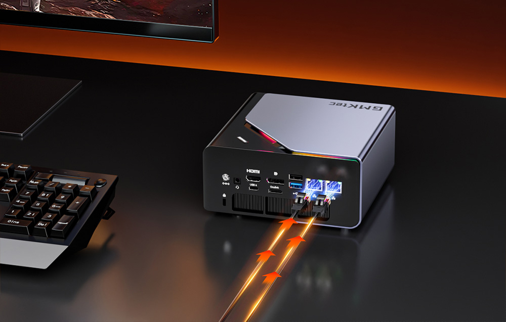 A GMKtec K12 két 2,5G Ethernet porttal van felszerelve, amelyek gyors és stabil adatátvitelt biztosítanak - akár 2500 MB/s sebességgel. Egy ilyen megoldás garantálja a megbízhatóságot a sávszélesség-igényes alkalmazásokban - az irodai munkától kezdve a nagyméretű fájlok átvitelén át a médiaszerverekig vagy a felügyeleti rendszerekig. A számítógép állandó átviteli sebességet és magas reakciókészséget biztosít, így minden körülmények között zökkenőmentes működést biztosít. A Wi-Fi 6E és a Bluetooth 5.2 technológia használatával a GMKtec K12 minden körülmények között gyors és stabil kapcsolatot biztosít. Az új Wi-Fi szabvány akár 2500 Mbps sebességet biztosít, ami 37%-kal magasabb, mint a Wi-Fi 6, ami villámgyors adatátvitelt és alacsony késleltetést jelent az online játékokhoz. A Bluetooth 5.2 viszont 2,5-szer gyorsabban működik, mint a 4.2-es verzió, garantálva a stabil kommunikációt az olyan perifériákkal, mint a fejhallgatók, billentyűzetek és kontrollerek.