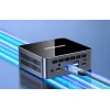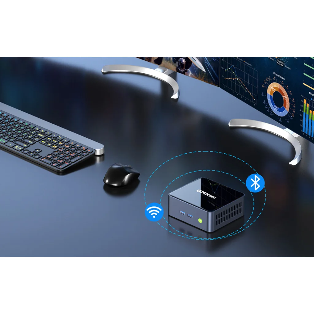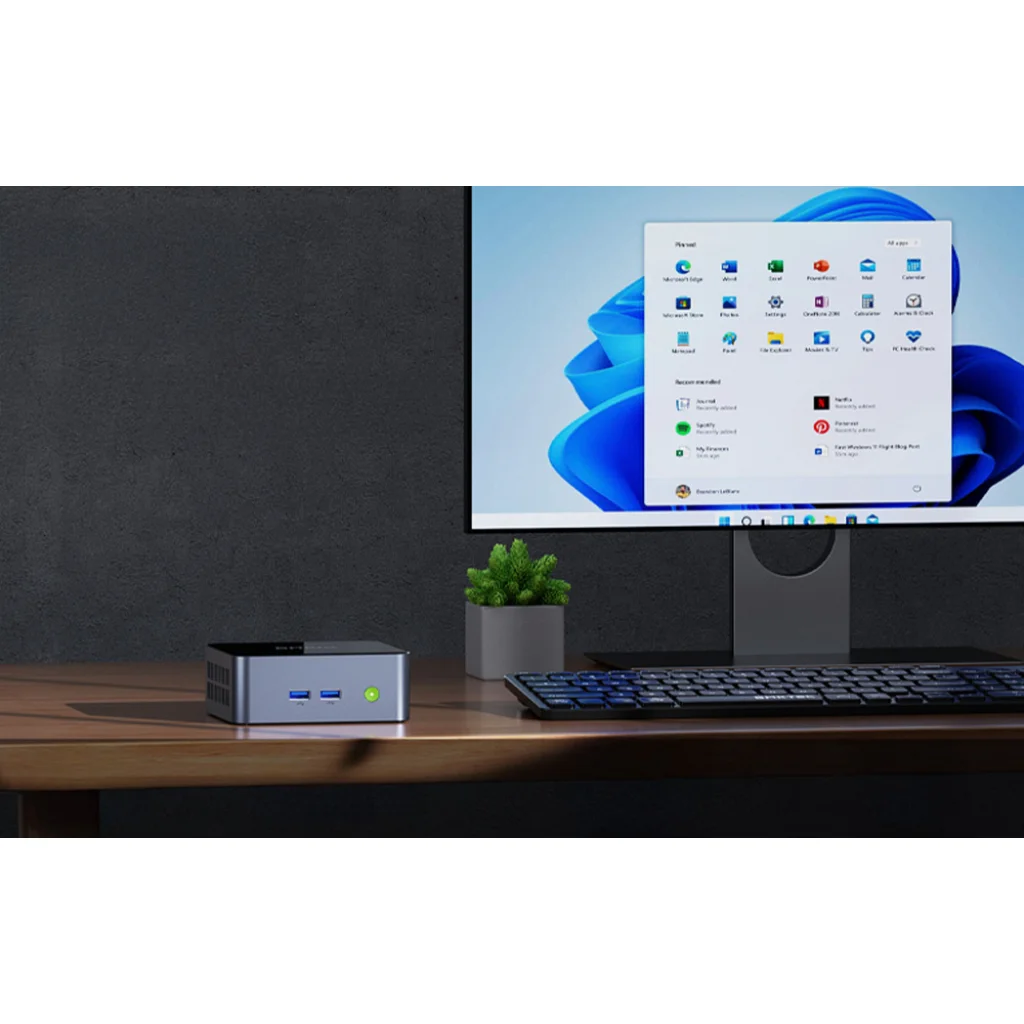 A mini PC olyan portkészlettel rendelkezik, amely lehetővé teszi több eszköz és monitor egyidejű csatlakoztatását. A ház elülső részén két USB-A 3.2 port található 5 Gbps sávszélességgel és egy bekapcsológomb. A hátoldalon egy USB-A 2.0 (480 MB/s) port, két további USB-A 3.2 port, egy USB-C 3.2 (10 Gbps) port DisplayPort és adatátviteli támogatással, két HDMI 2.0 (4K@60Hz) port, egy RJ45 2,5G LAN port, egy 3,5 mm-es CTIA audiocsatlakozó és egy DC 20V/5A tápcsatlakozó található. Az így kialakított elrendezés kényelmet biztosít a mindennapi használat során, és számos kiegészítő csatlakoztatását teszi lehetővé - a 4K monitoroktól és külső meghajtókon át a hangkészletekig és hálózati eszközökig.