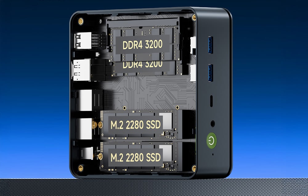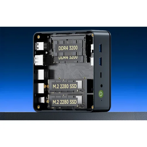 A GMKtec M5 Ultra úgy lett kialakítva, hogy könnyen hozzáférjen az alkatrészekhez, így gyorsan bővítheti konfigurációját. A DDR4 3200 MHz-es RAM 64 GB-ig bővíthető, a két M.2 2280 (PCIe 3.0) foglalat pedig akár 16 TB összkapacitású SSD-ket is befogadhat. A kialakításnak köszönhetően az alkatrészekhez könnyű hozzáférni, így a frissítés kevés időt vesz igénybe, és nem igényel speciális szerszámokat.