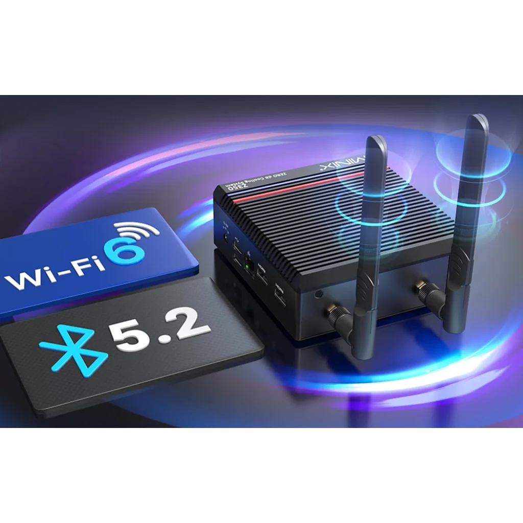 A készülék modern kommunikációs megoldásokat kínál - a kétsávos Wi-Fi 6 (Intel® AX201), a Bluetooth 5.2 és a vezetékes Ethernet 2,5G port gyors adatátvitelt és stabil hálózati kapcsolatot garantál. A két HDMI 2.1 port két 4K monitor csatlakoztatását teszi lehetővé, míg az USB-A 3.2 Gen2 és USB-C 3.2 Gen2 (mind 10 Gbps) portok modern perifériák csatlakoztatását teszik lehetővé. A fedélzeten USB 2.0 portok, egy fejhallgató/mikrofon kombinált csatlakozó és egy TF-kártya foglalat is található, így a felhasználók teljes konfigurációs rugalmasságot élvezhetnek.